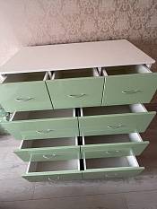 Собрали комод, который сами для себя придумали на основе имеющихся образцов с 9-ю выдвижными ящиками. Фасады с фрезеровкой выполнены и подогнаны очень хорошо. Рисунок был сложный, но все совпало и получилось очень красиво. Отдельное спасибо за нижнюю планку фасада на цоколь- получился единый рисунок и современный внешний вид. Есть замечания по глубине ящиков, т.к. в собранном виде ящики не доходят до задней стенке на 6 см. Как-то этот момент не согласовали. Думаю, сто можно было на 5 см точно увеличить глубину ящиков, что было бы функциональнее, т.к. комод это не только фасад, но и шкаф для вещей, постельного белья и Эти 5см я учитывала при выборе размера комода. Если проблема в фурнитуре, то можно было это обсудить. А так, нам теперь с этим жить. Ещё сборка тоже в некоторых местах не продумана ( центральные внутренние отверстия под симметричные направляющие почему-то одно сквозное. Получается, что направляющие с одной стороны прикрутили, а потом с другой стороны центральной стойки в те же отверстия нужно прикручивать с другой стороны направляющие. Шурупы ломаются друг о друга и конструкция кривая. Пришлось подгонять самим. Не хватило 2-х больших шурупов для сборки корпуса. Думаю, что лучше больше класть, чем меньше. Это уже 2-й наш большой заказ. В любом случае большое спасибо, что Вы воплощает наши мечты! Отдельное огромное спасибо инженеру-конструктору и мастеру по внешнему виду фрезеровки. Получилось ОГОНЬ!