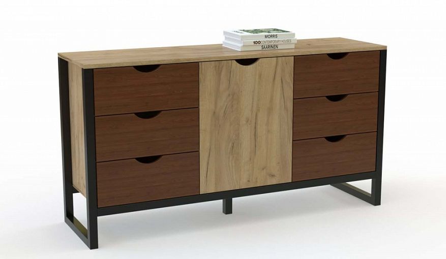 Комод Шалфей Лайт 1 BMS в натуральных древесных оттенках скомбинирован с контрастным металлическим каркасом. Лаконичная по форме модель станет частью актуального интерьера с элементами индустриального стиля. Удобный для размещения аппаратуры, декоративных предметов и всевозможных бытовых мелочей, комод оборудован распашным отделением и шестью выдвижными ящиками, оснащенными полукруглыми вырезными ручками. Купить комод Шалфей Лайт 1 BMS вы сможете в нашем интернет-магазине, подобрав цветовое решение.