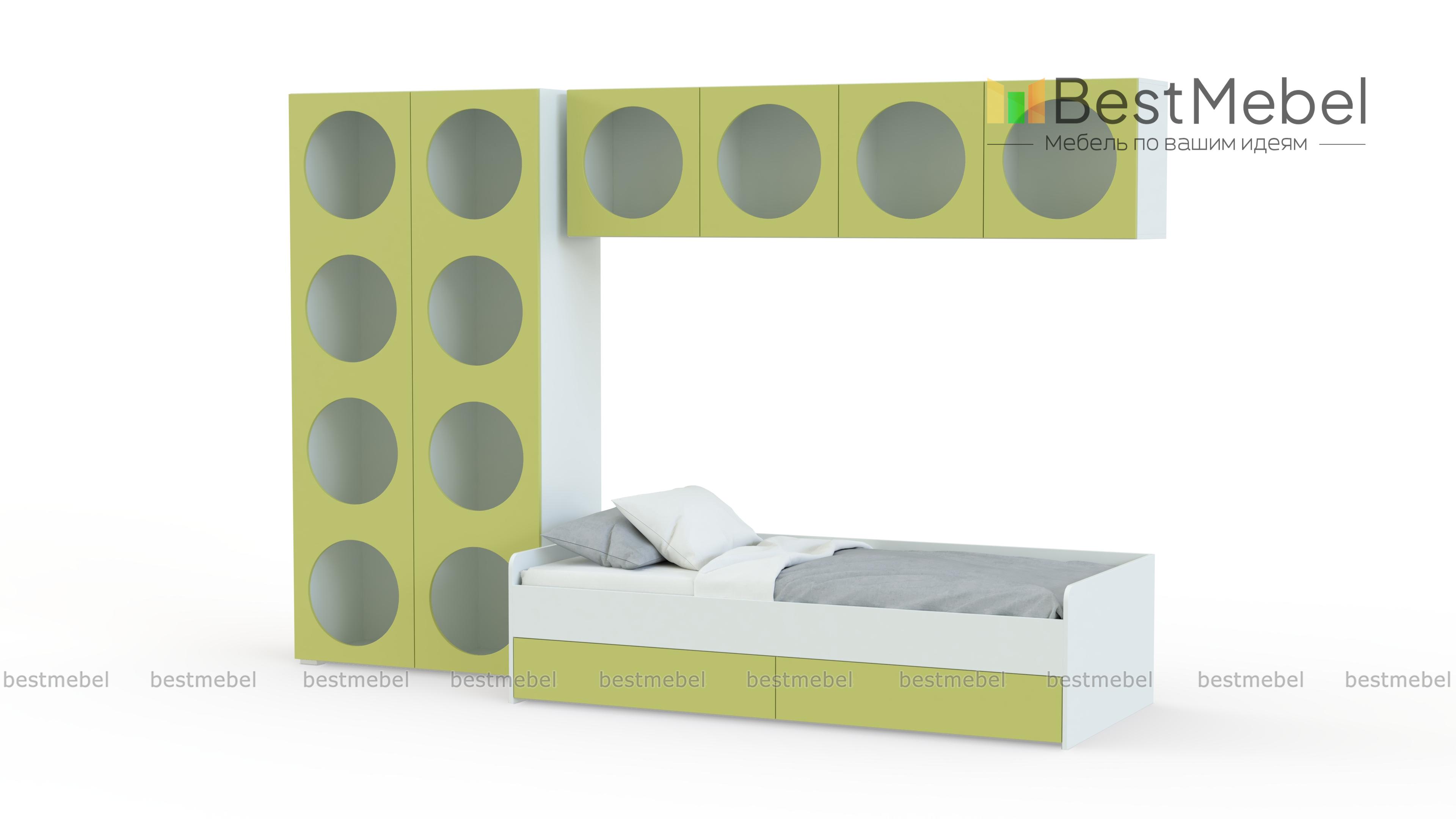 Детская комната Авелин 4 BMS с необычной геометрией и трендовыми оттенками создана специально для современных подростков. Свободно расположить на виду любимые гаджеты, игрушки и книги поможет большое количество открытых круглых полок. Выделенную с помощью шкафа и подвесных полок зону отдыха занимает практичная кровать с парой бельевых ящиков. Купить детскую комнату Авелин 4 BMS вы всегда сможете в нашем интернет-магазине, по желанию изменив цвета и размеры.