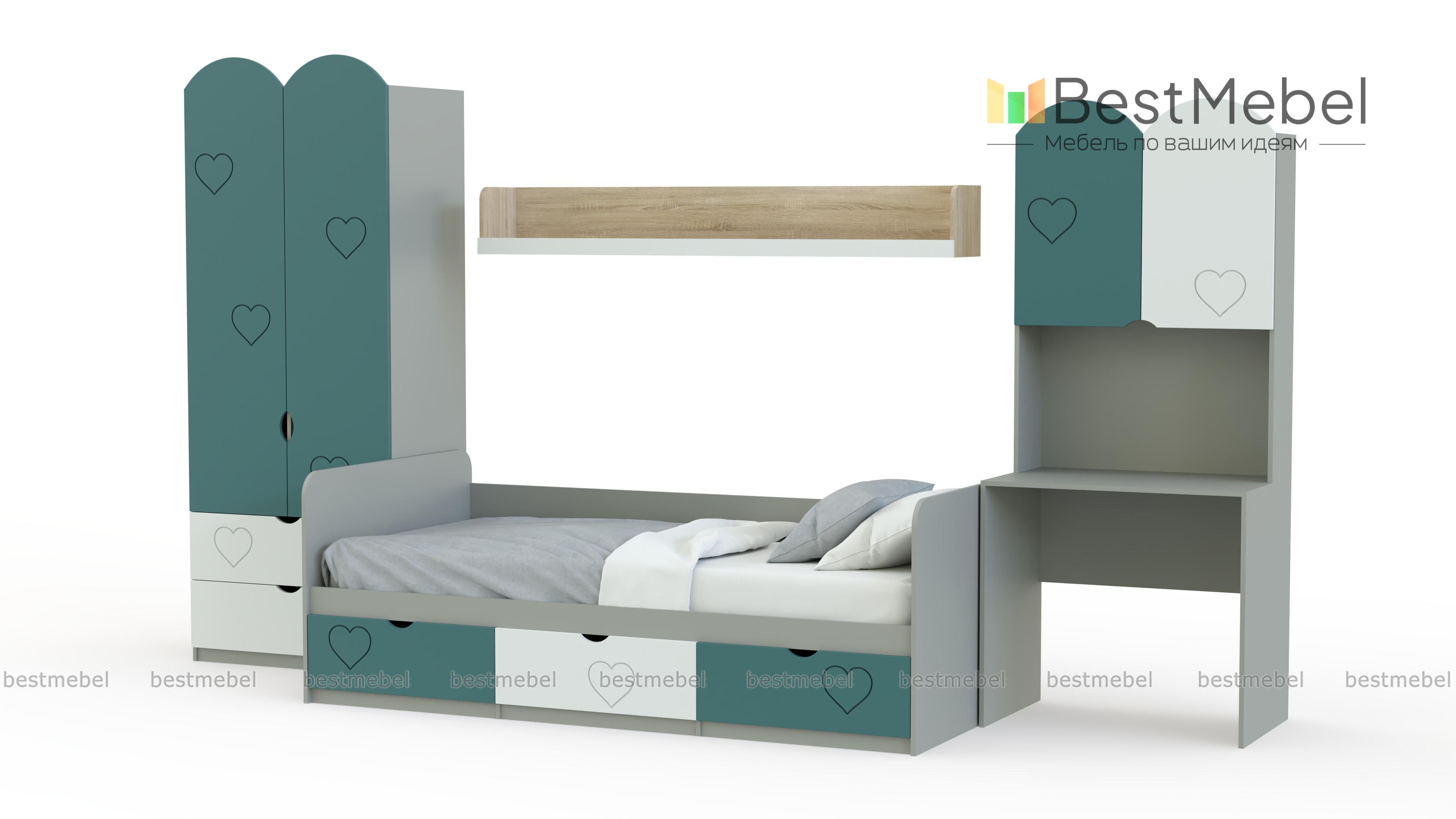 Детская комната Сказка 21 BMS оборудована всем самым необходимым для комфортного отдыха, учебы и хранения вещей ребенка. В комплекте кровать с тремя выдвижными ящиками для постельного белья или игрушек в основании, платяной шкаф и компьютерный стол с надстройкой в виде распашного шкафчика. Корпус древесного оттенка дополняют фасады в терракотовом цвете, украшенные фрезеровкой, дверцы фигурно вырезаны. Купить детскую комнату Сказка 21 BMS приглашаем в наш интернет-магазин.