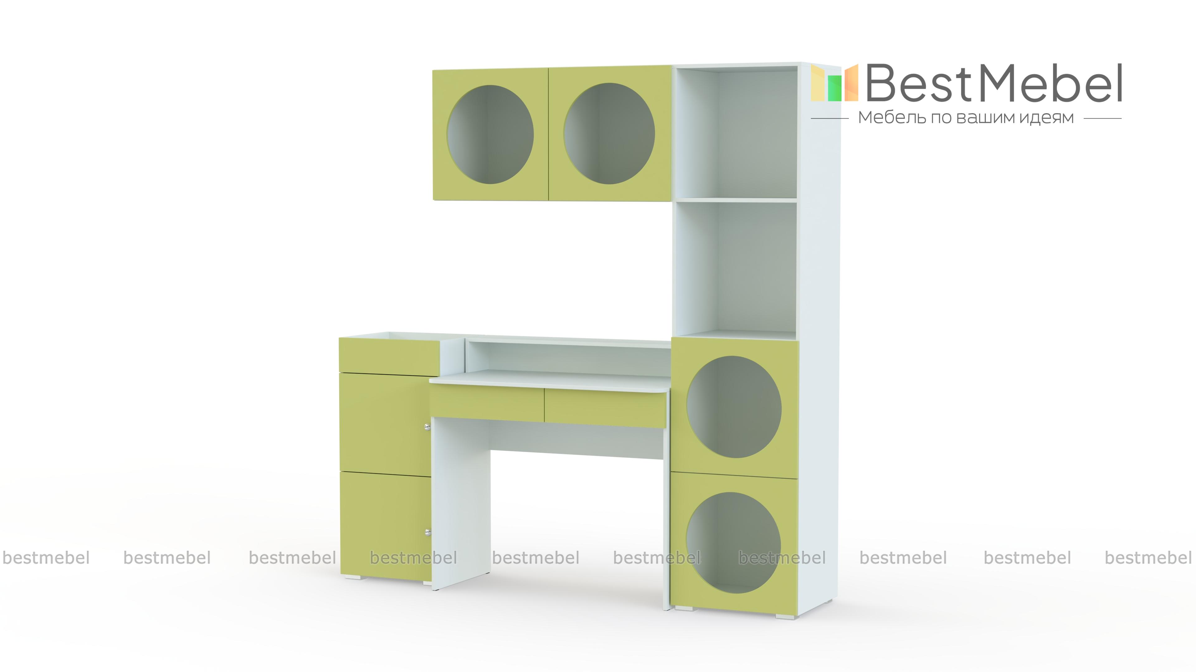 Детская стенка Авелин 4 BMS с круглыми полками поможет организовать рабочую зону в современной квартире. Больше места для хранения канцелярских принадлежностей обеспечит высокая тумба, столик дополнен нишей и ящиками, а в комплекте к стеллажу идет широкая подвесная полка. Стильную геометрию предметов подчеркивает контрастная цветовая гамма. Купить детскую стенку Авелин 4 BMS с выбором размеров, цвета и фурнитуры приглашаем на сайт нашего интернет-магазина.