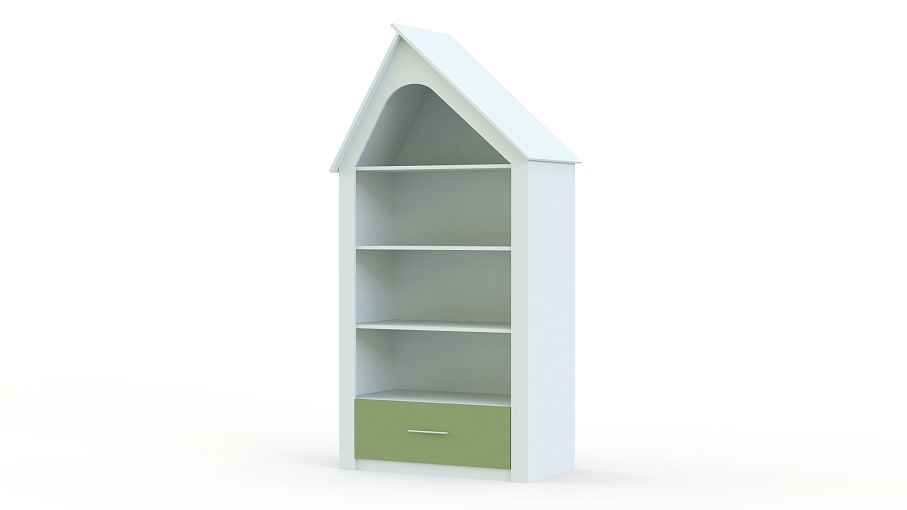 Стеллаж Домик 5 BMS станет частью уютного детского интерьера и поможет компактно разместить любимые игрушки, книги, принадлежности для творчества и многое другое. Модель, выполненная в форме домика, оборудована просторными открытыми полками и выдвижным ящиком в основании. Корпус в универсальном белом цвете дополняет зеленый матовый фасад. Купить стеллаж Домик 5 BMS и внести в меблировку детской комнаты игровой элемент вам поможет наш интернет-магазин.