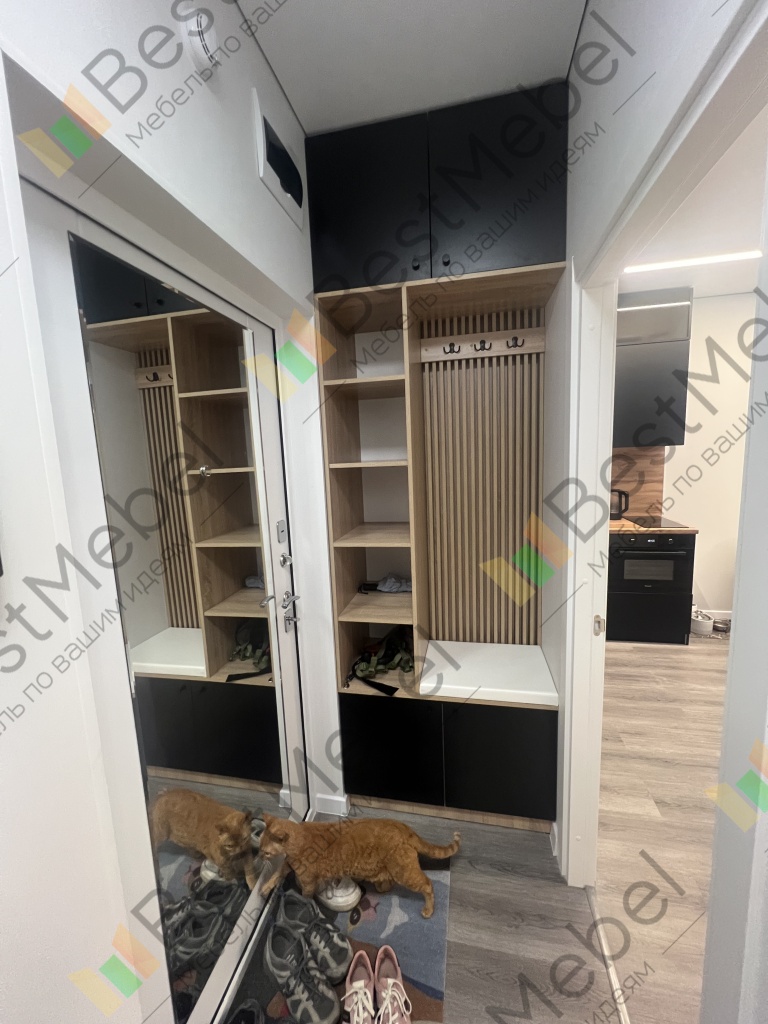 Прихожая Дублин 24 BMS имеет небольшую ширину, поэтому прекрасно подходит для малогабаритных помещений. Композиция состоит из панелей открытой вешалки с крючками, стеллажа, антресоли и закрытых дверцами обувных полок. Однотонные фасады без лицевой фурнитуры красиво выделяются на фоне корпуса в древесных тонах, сиденье имеет износостойкую мягкую обивку. Купить прихожую Дублин 24 BMS с выбором цветовой гаммы и размеров вы сможете на сайте нашего интернет-магазина.