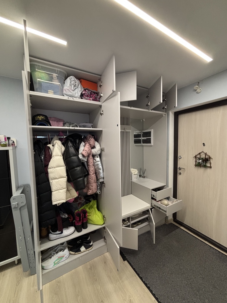 Заказ 00000103349.Взяли прихожую "Дублин 34 BMS" и в целом очень довольны, но сборка – это отдельная история. Главный плюс, который нас покорил – возможность заказать точный размер и цвет. У нас прихожая довольно узкая, и стандартные варианты просто не подходили. Сделали под наши замеры – встала идеально, как будто так и было задумано. Цвет выбрали серый – смотрится очень стильно, современно и правда делает маленькое пространство светлее и визуально просторнее. Функционально – все отлично. Места хранения действительно много: и верхние, и нижние шкафы легко вмещают все куртки, даже толстые зимние. Платяное отделение – спасение для вещей, которые не хочется мять. Очень удобна открытая вешалка с большим зеркалом – можно быстро что-то повесить или посмотреть на себя перед выходом, не бегая в ванную. Ящики внизу здорово организовали всю мелочь – перчатки, шапки, шарфы теперь не теряются. Качество на вид хорошее: фасады ровные, фурнитура пока не подводит (доводчики и шариковые направляющие). Но есть один существенный минус – сборка. Деталей очень много. Когда распаковали все коробки, немного растерялись от количества упаковок и элементов. Инструкция вроде понятная, но сам процесс требует времени, терпения и много свободного места. Собирать в одиночку – крайне сложно и долго.Нам с мужем пришлось потратить почти целый день, работая вдвоем, и это было довольно напряжно. Если вы один или не уверены в своих силах – советую сразу закладывать стоимость сборки мастера или звать очень опытного помощника.Если вы готовы к сборке (или закажете ее) – это отличный вариант для организации порядка в прихожей. Мы довольны результатом, хоть и пришлось попотеть. Выглядит дороже, чем стоит!