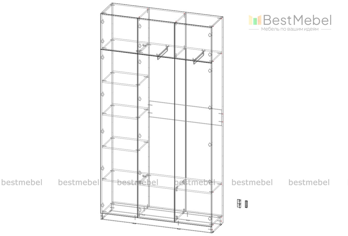Современный дизайн и стильная фурнитура придают шкафу изысканный вид, делая его не только функциональной, но и декоративной частью интерьера.Шкаф оснащен просторными полками, выдвижными штангами, что обеспечивает удобную организацию пространства и позволяет легко поддерживать порядок. Шкаф без ручек, приобрести ручки вы можете в нашем интернет магазине отдельно.