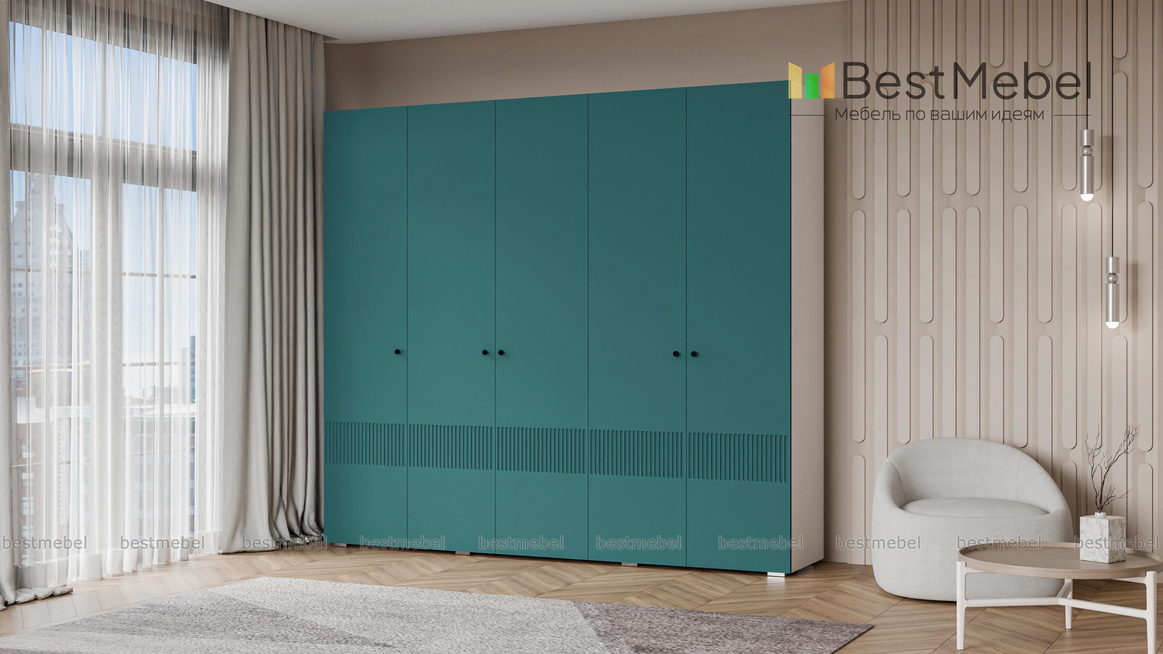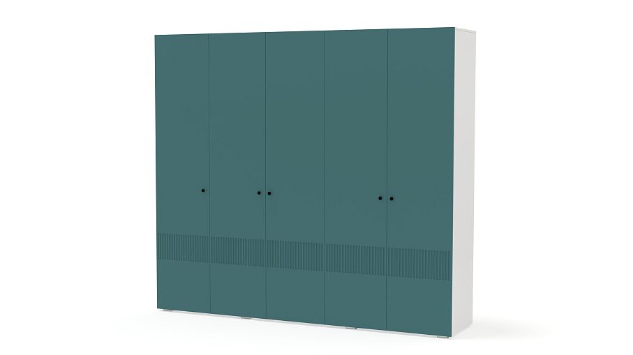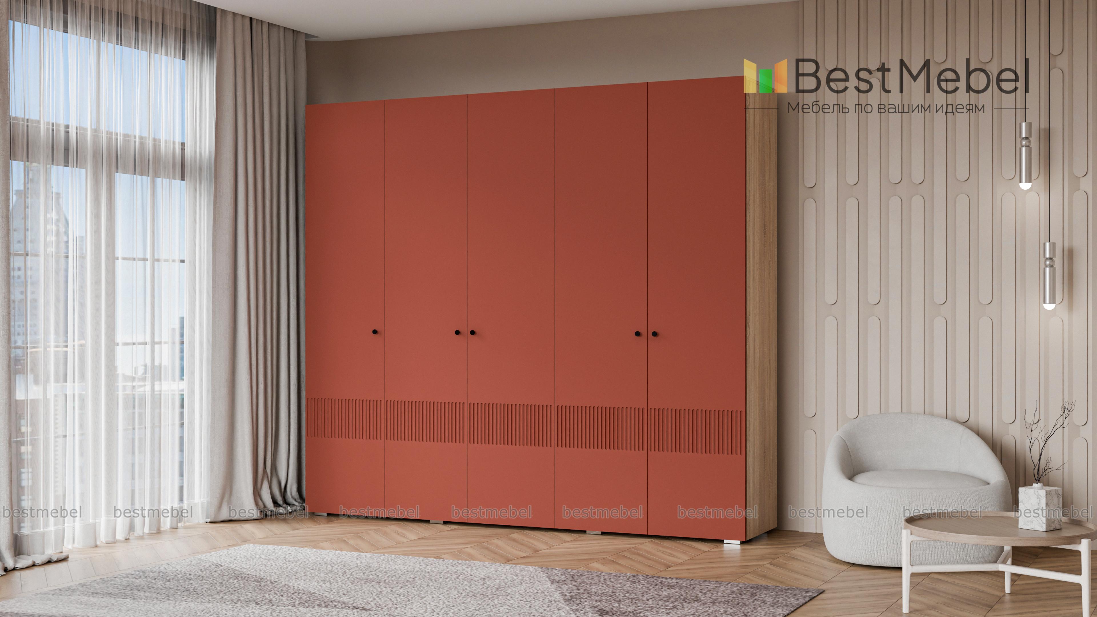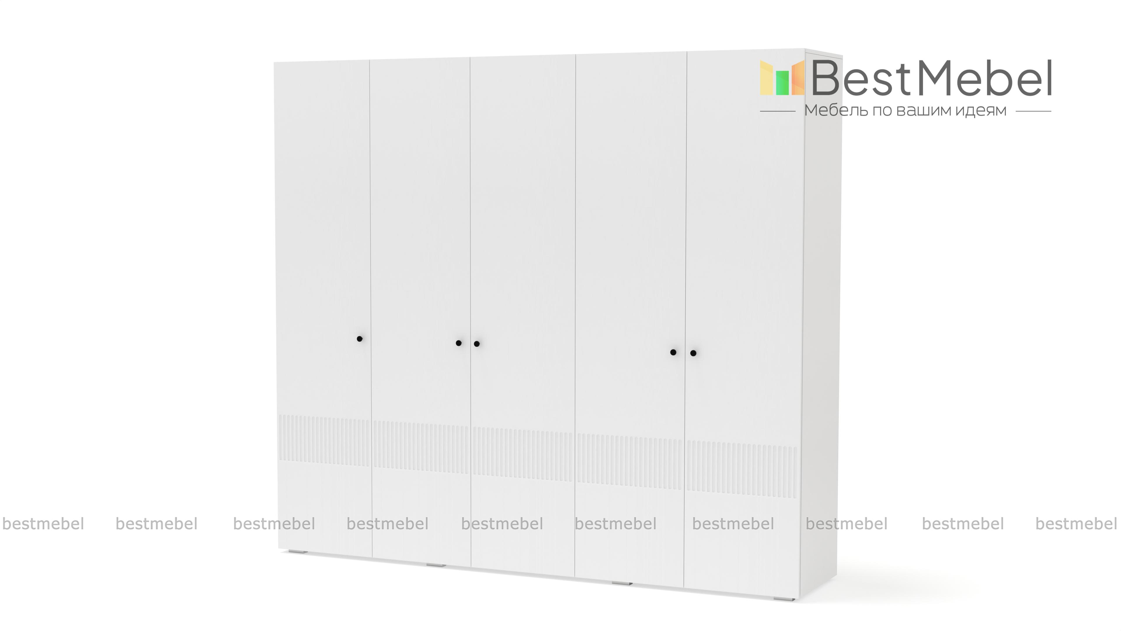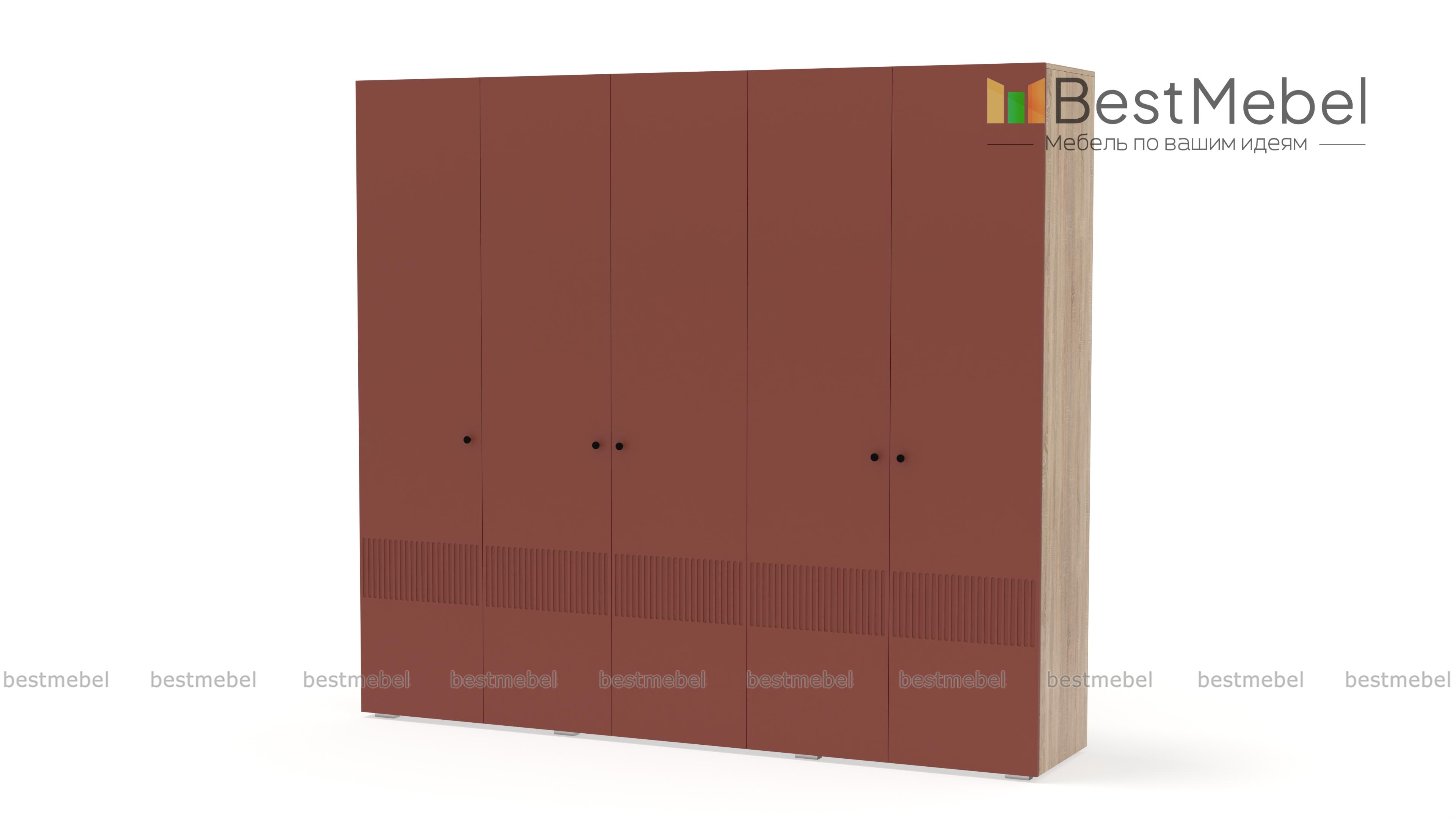 Шкаф распашной Джосс 5 BMS — это яркая современная модель с цветным фасадом и фрезеровкой. Комплектация с двумя штангами и полками подходит как для сложенной, так и развешанной на вешалках одежды, а также обуви и коробок с аксессуарами. С помощью этого пятидверного шкафа вы сможете удобно и эстетично организовать хранение гардероба для двух человек. Купить шкаф распашной Джосс 5 BMS с выбором размеров, цвета и фурнитуры приглашаем к нам в интернет-магазин.