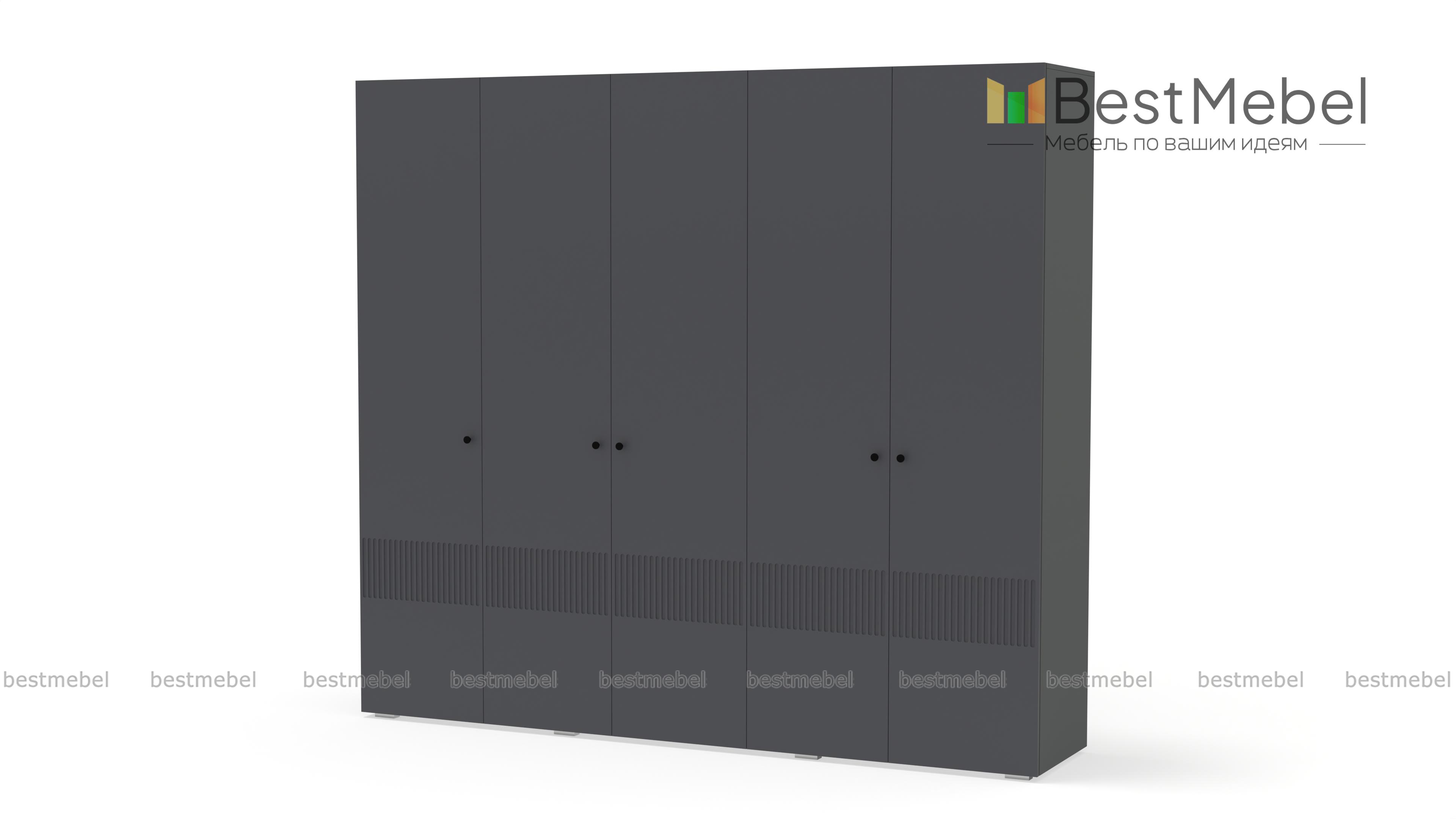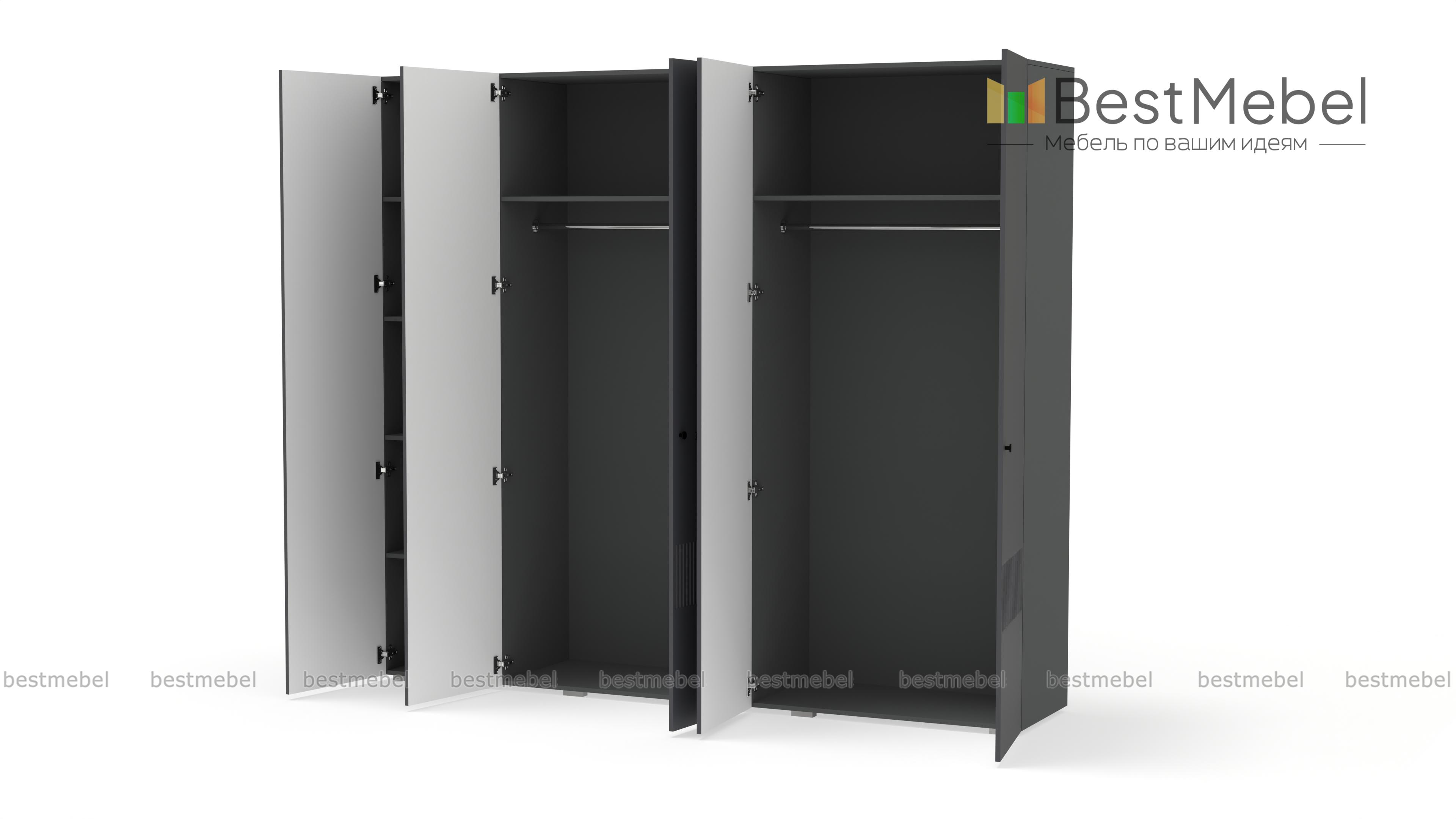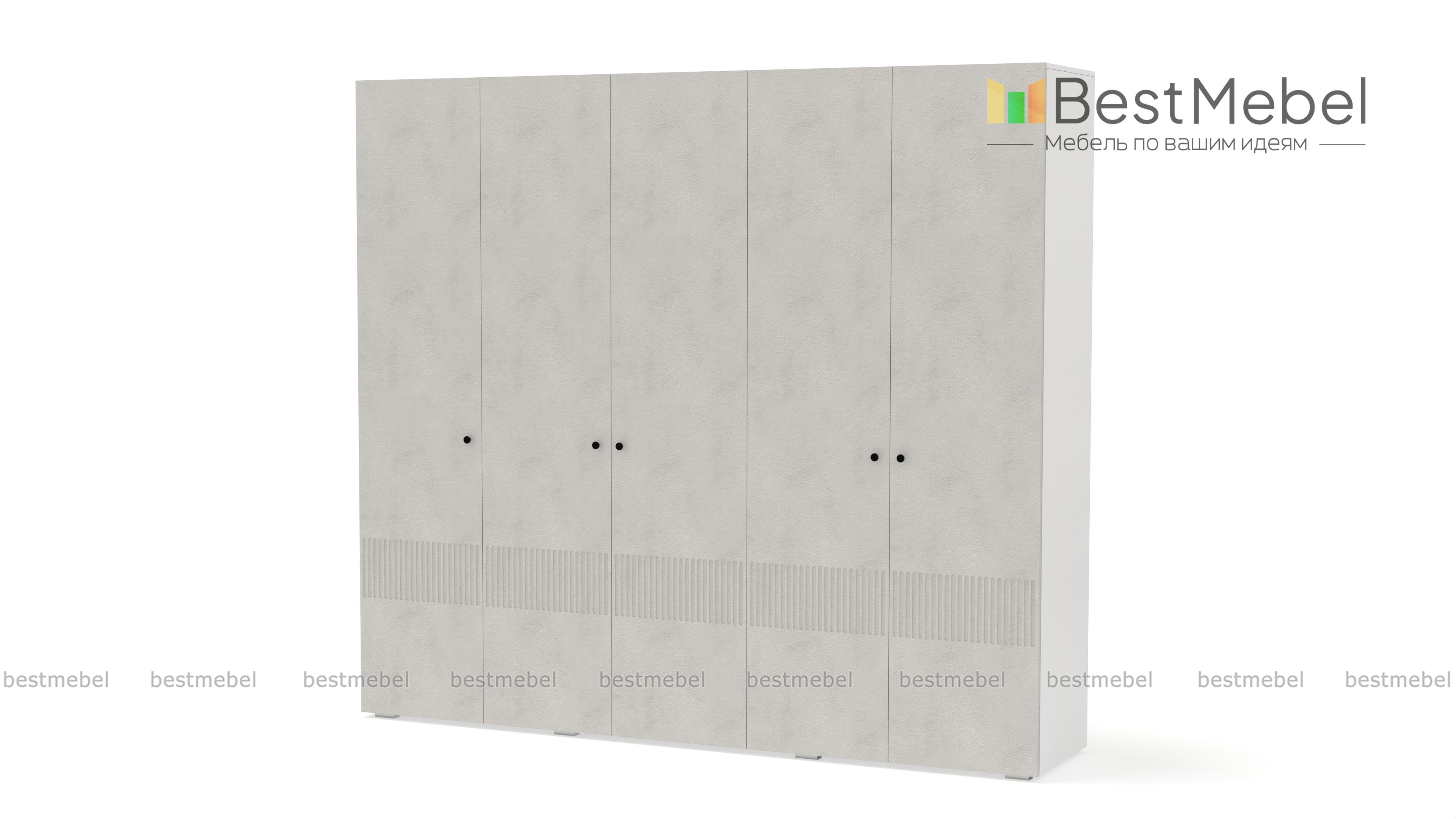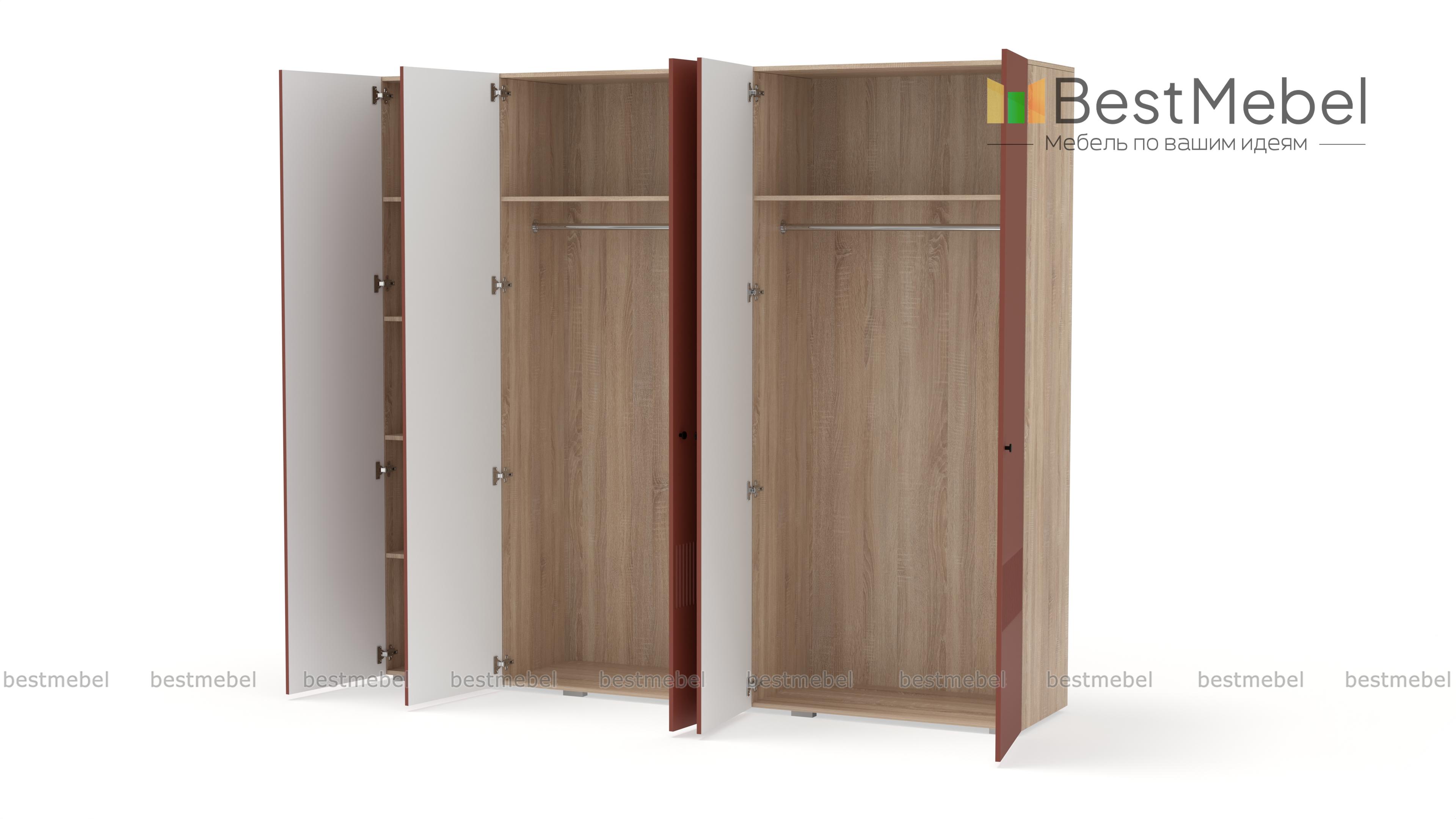 Шкаф распашной Джосс 5 BMS — это яркая современная модель с цветным фасадом и фрезеровкой. Комплектация с двумя штангами и полками подходит как для сложенной, так и развешанной на вешалках одежды, а также обуви и коробок с аксессуарами. С помощью этого пятидверного шкафа вы сможете удобно и эстетично организовать хранение гардероба для двух человек. Купить шкаф распашной Джосс 5 BMS с выбором размеров, цвета и фурнитуры приглашаем к нам в интернет-магазин.