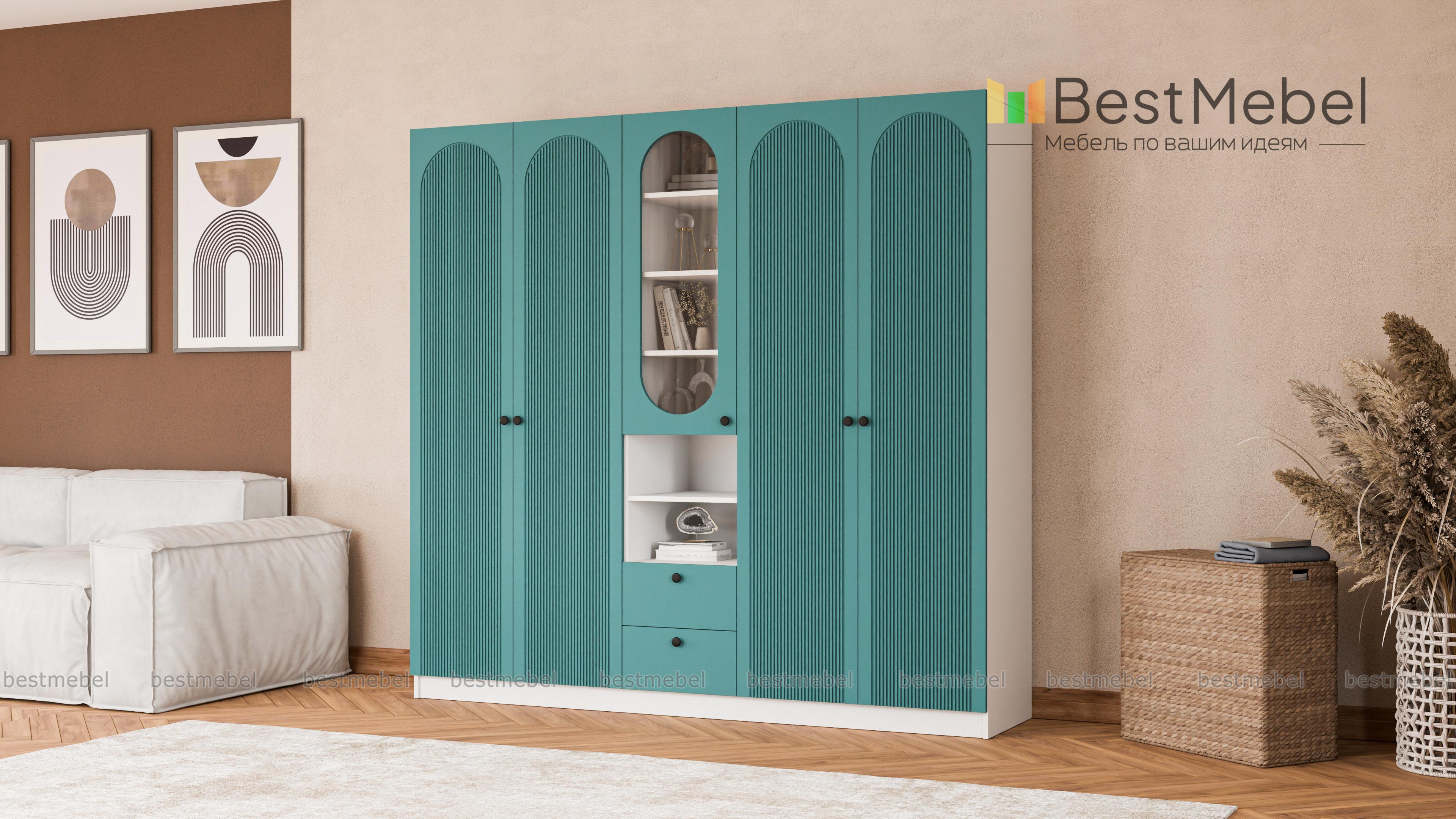 Шкаф распашной Рене 15 BMS — это композиция для гостиной или спальни, объединившая двухдверные отделения для одежды и комбинированную с ящиками и полками витрину. В одном месте будут компактно храниться предметы гардероба, важные мелочи, книги и еще многое другое. Фрезеровка на дверцах шкафа, выполненных из МДФ, повторяет форму изящных вырезов витрин. Купить шкаф распашной Рене 15 BMS, изготовленный по вашим размерам из качественных материалов, приглашаем в наш интернет-магазин.