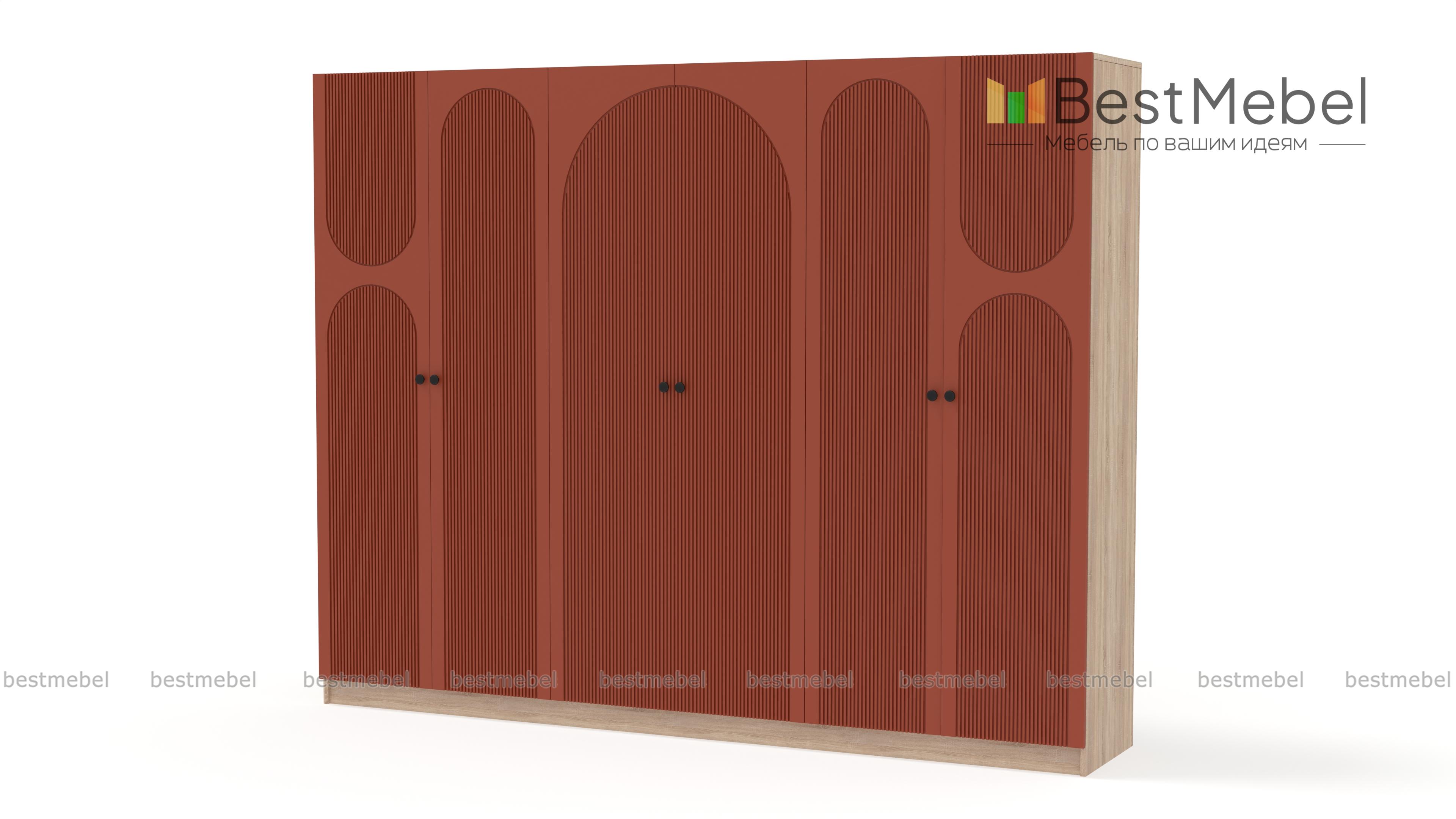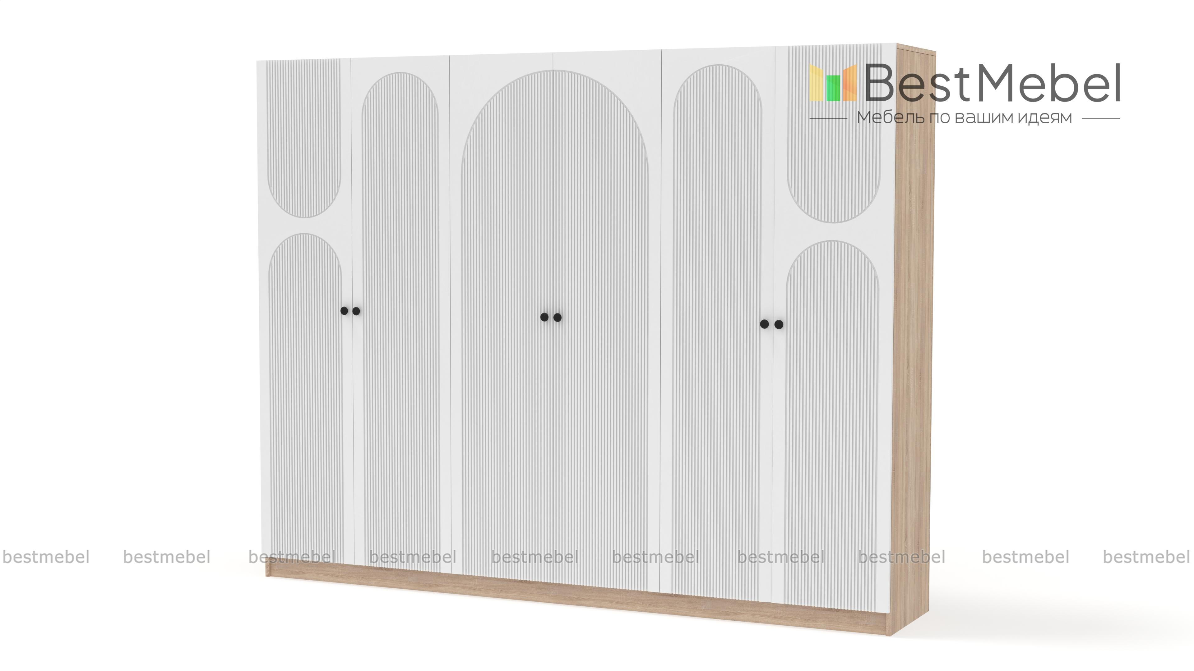 Шкаф распашной Рене 34 BMS отличается вместительностью и выразительным современным дизайном. На темном фасаде эффектно смотрится фрезеровка, корпус из ламинированной ДСП выполнен в древесных тонах. Шестидверная модель укомплектована необходимыми для хранения одежды на вешалках, трикотажа и постельных принадлежностей мебельными штангами и полками. Купить шкаф распашной Рене 34 BMS вы сможете на сайте нашего интернет-магазина в удобном размере и оттенке из каталога.