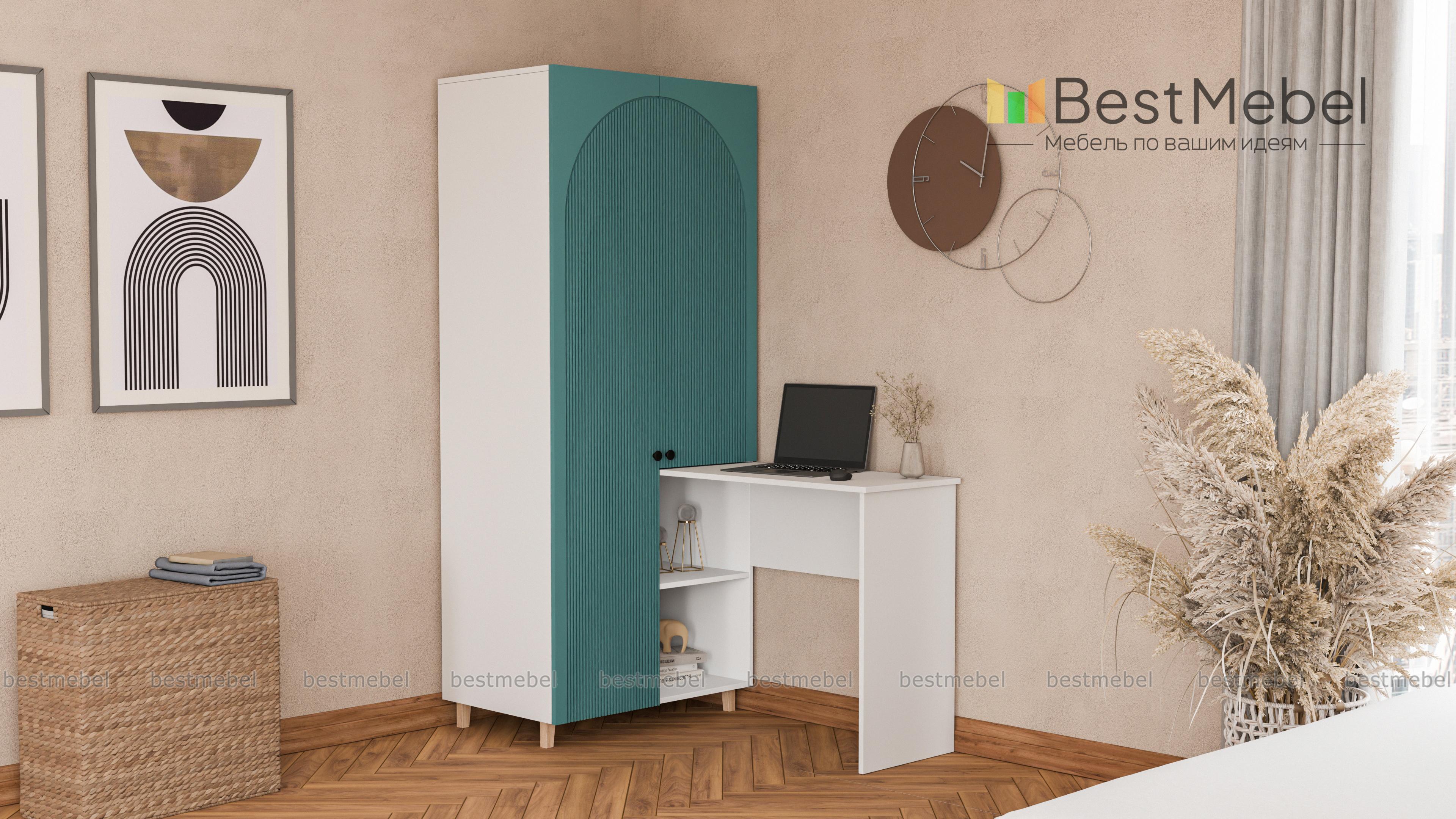 Шкаф со столом Вивьен 3 BMS — функциональная и стильная мебель в небольшую комнату. Угловая конструкция из распашного шкафа с двумя открытыми секциями и письменного столика объединила рабочую зону с удобной системой хранения. Качественные материалы обеспечивают этой модели надежность, а выразительный дизайн создают актуальные оттенки и стильная фактура фасада. Купить шкаф со столом Вивьен 3 BMS, изготовленный по вашим размерам, можно на сайте нашего интернет-магазина.