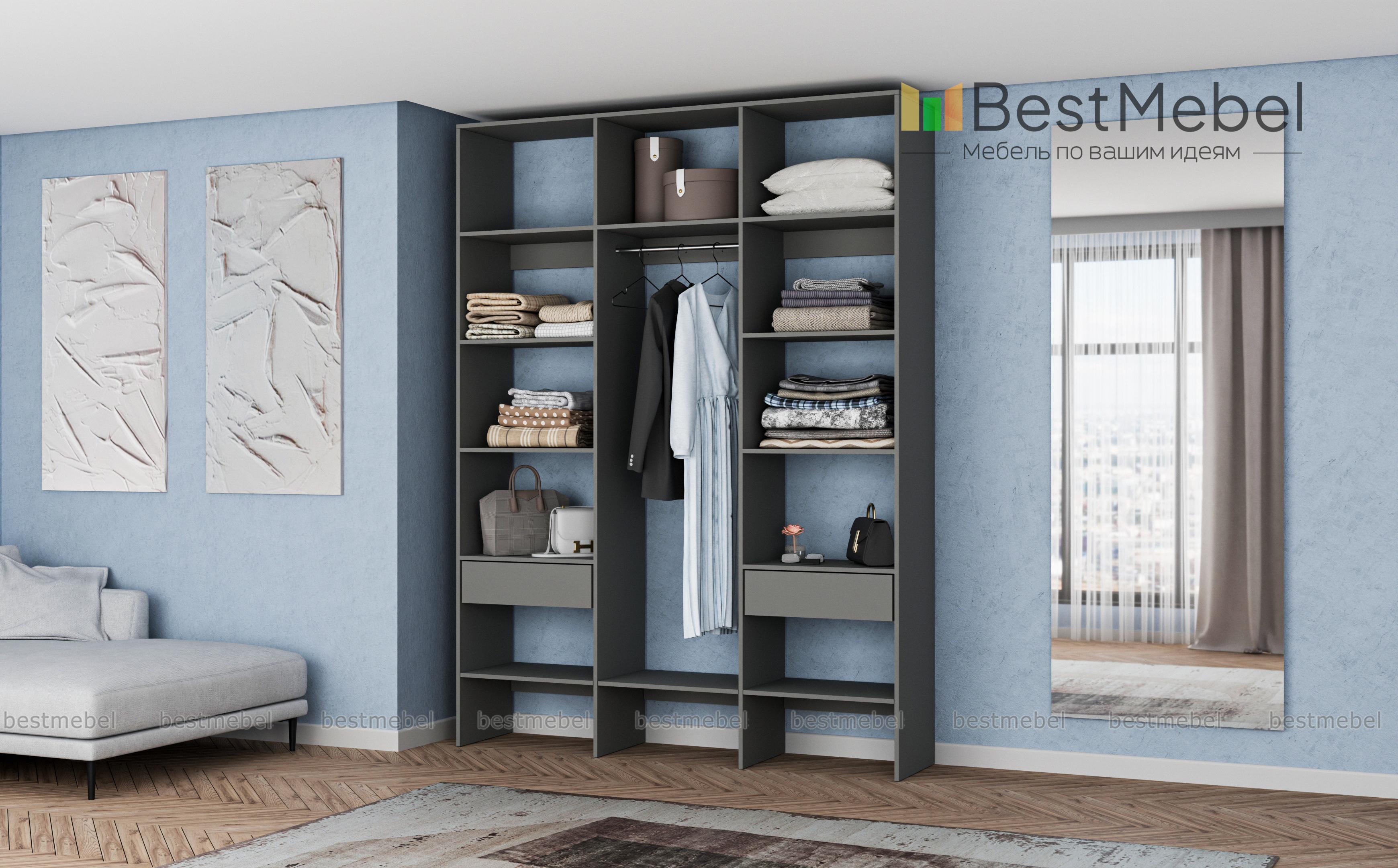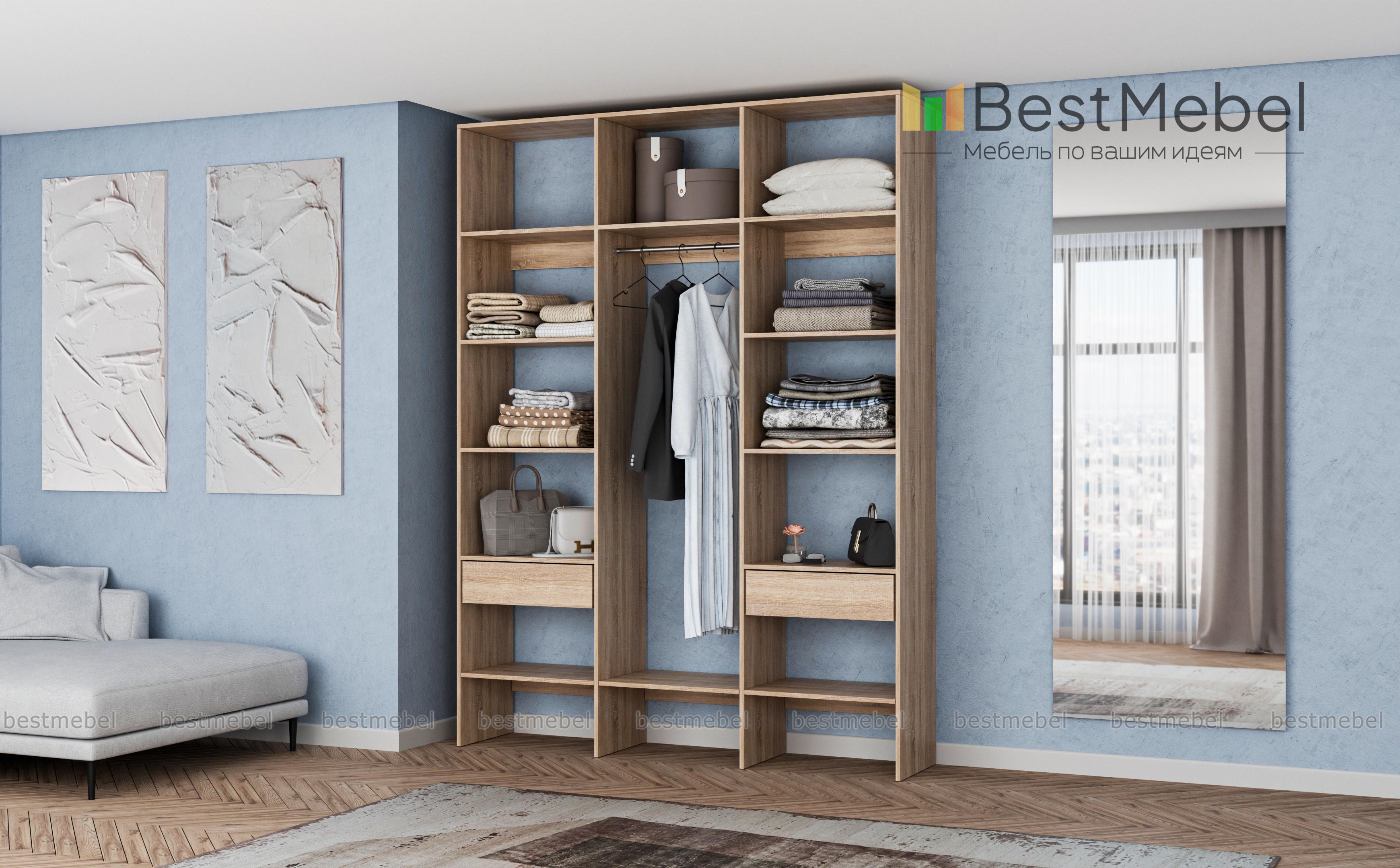 Стеллаж для одежды Мирта 14 BMS разработан специально для хранения в открытом доступе одежды, обуви и прочих предметов гардероба. В центре располагается отделение со штангой, а по периметру – открытые секции и два выдвижных ящика для мелких вещей. Визуально легкий и прочный, стеллаж выполнен из ЛДСП – износостойкого материала с широким выбором цветовых решений. Купить стеллаж для одежды Мирта 14 BMS, изготовленный по вашим размерам, вы всегда сможете на сайте нашего интернет-магазина.