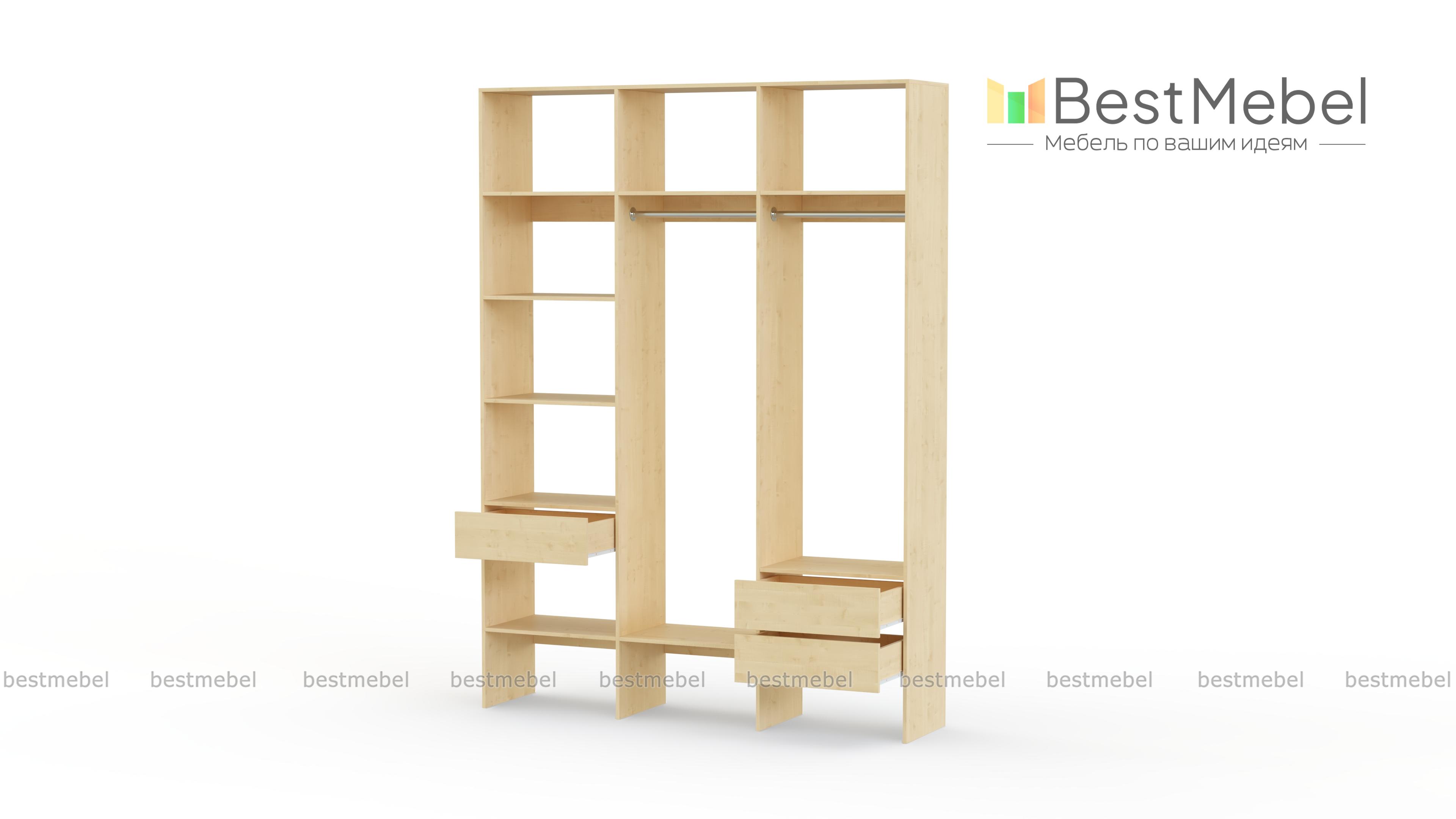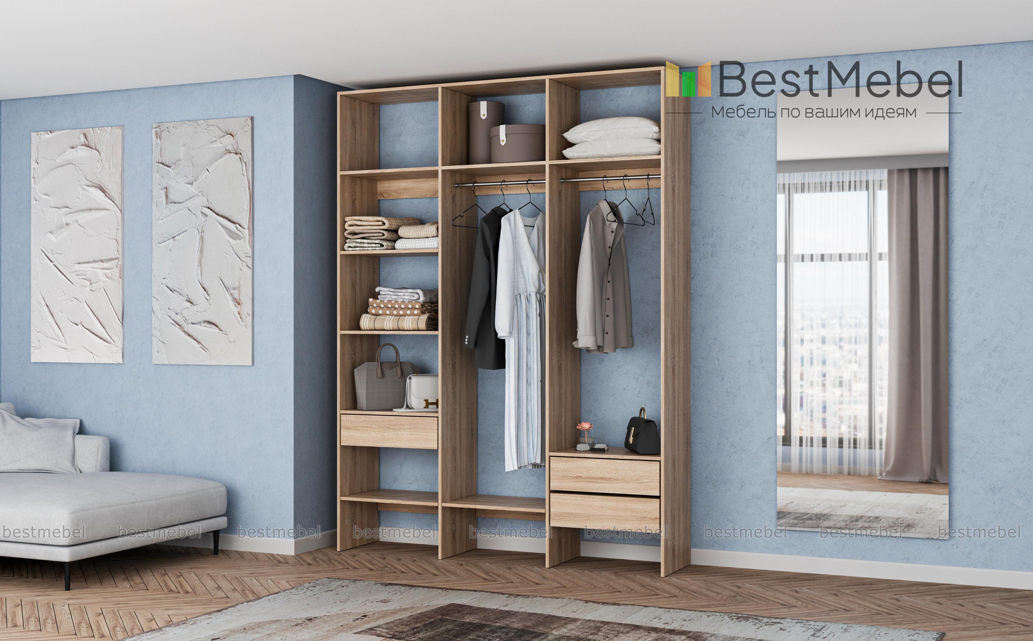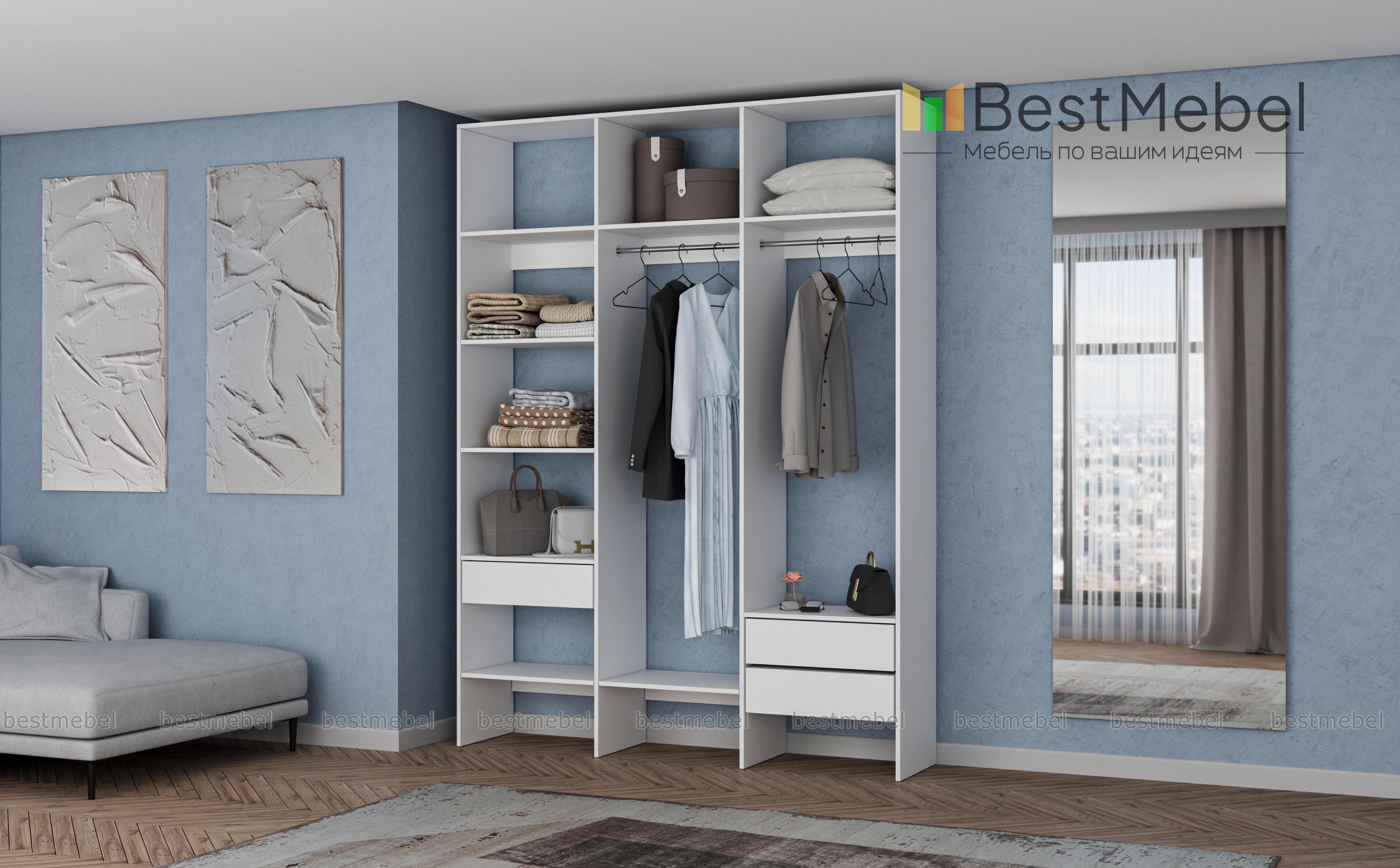 Стеллаж для одежды Мирта 16 BMS сэкономит место в гардеробной, компактно разместив вещи. Два платяных отделения объединены с просторными полками для сложенных вещей, а справа и слева предусмотрены выдвижные ящики под аксессуары. За ламинированным покрытием легко ухаживать, благодаря чему стеллаж надолго сохранит первоначальный внешний вид. Купить стеллаж для одежды Мирта 16 BMS в оттенках нашего каталога и удобном размере вы сможете на сайте интернет-магазина.