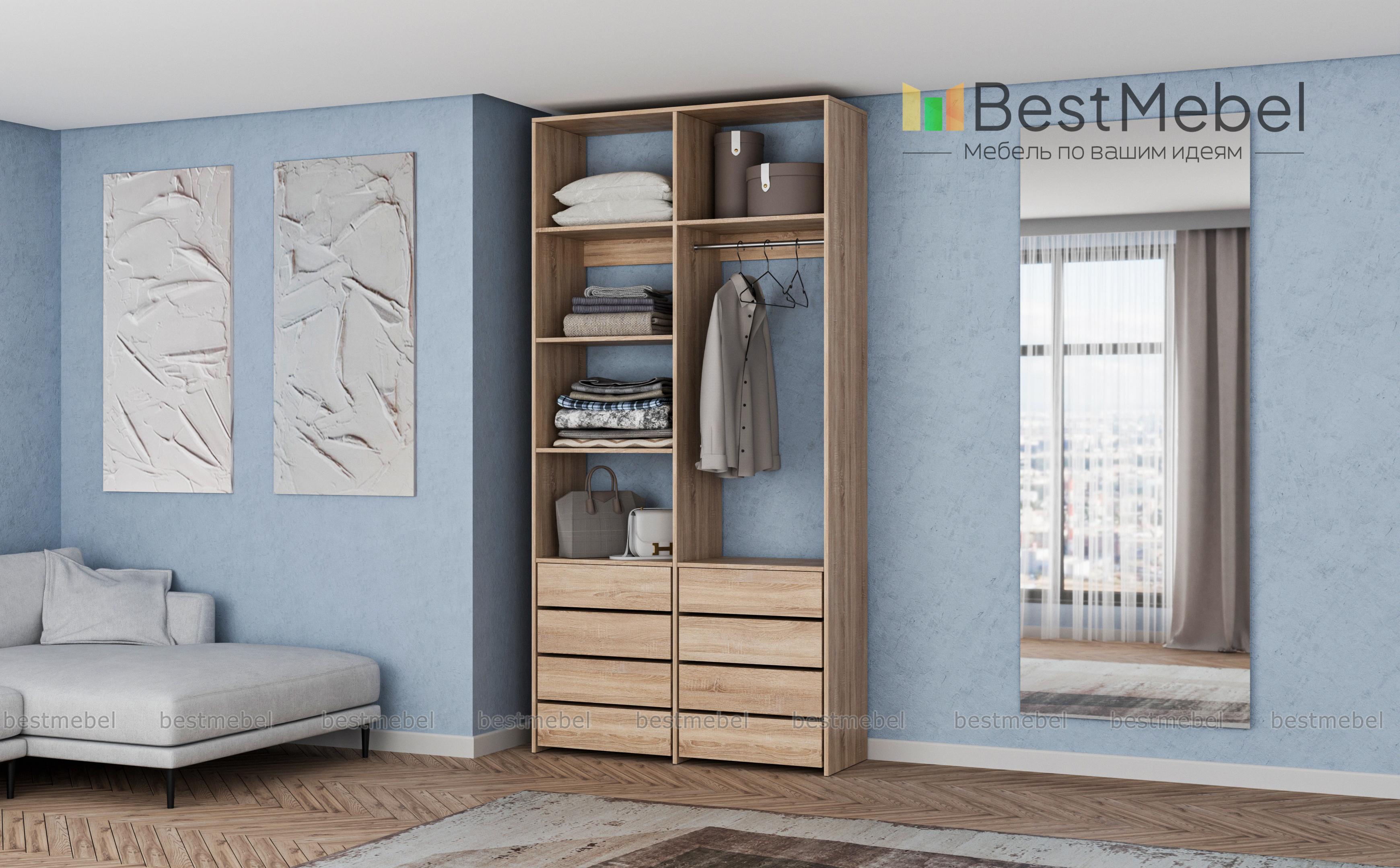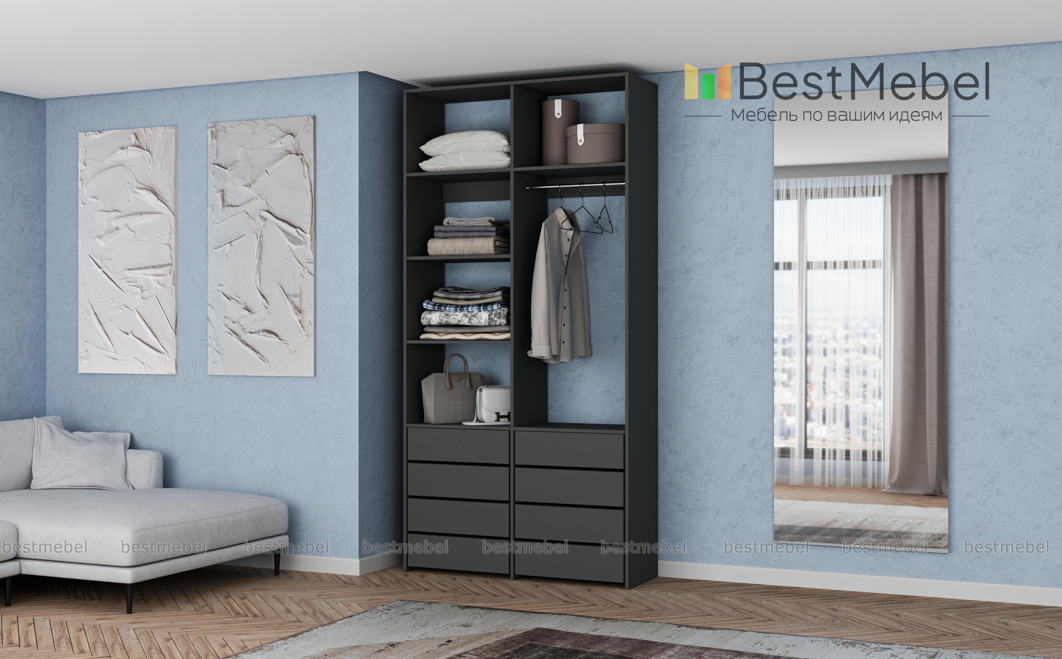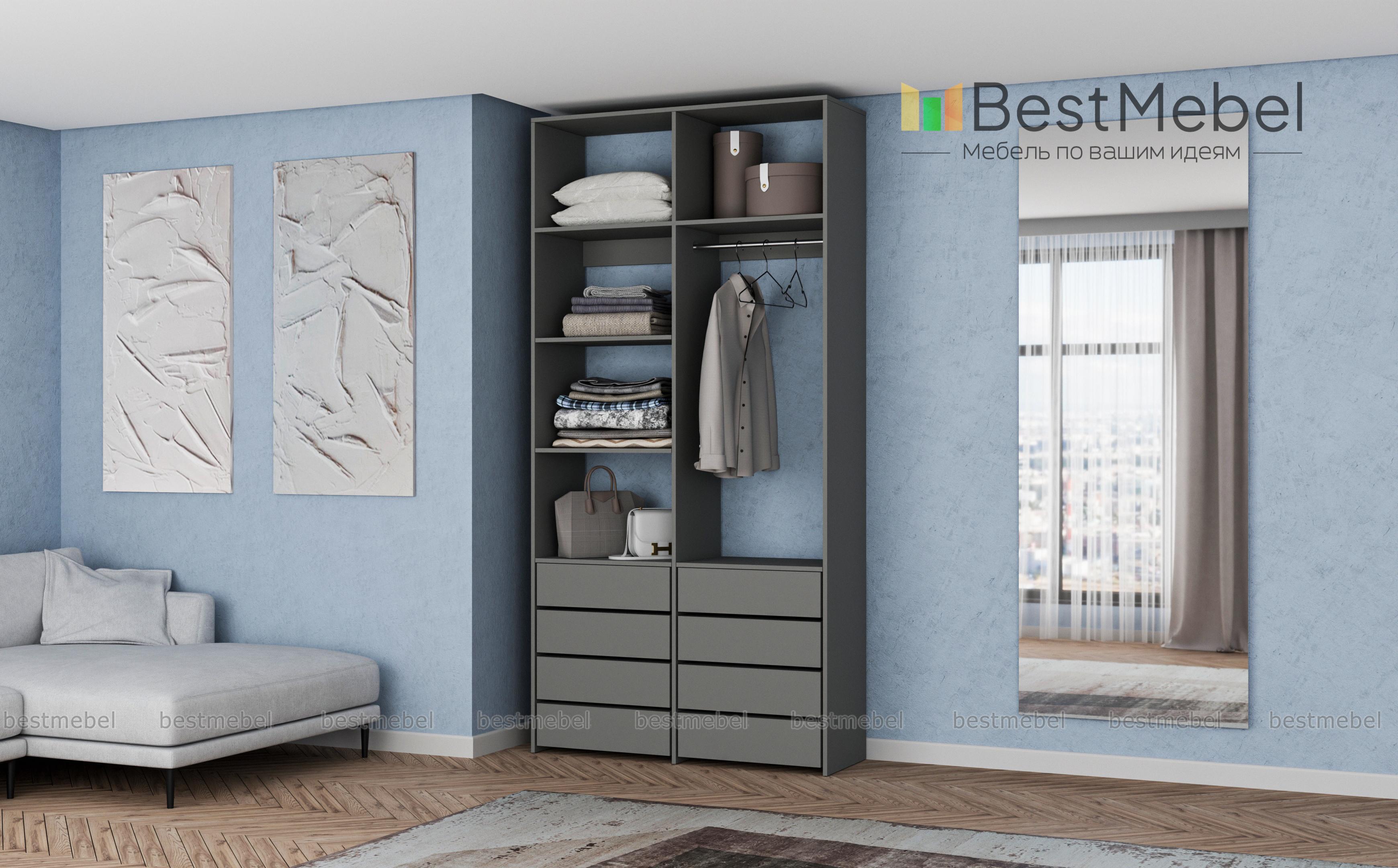 Стеллаж для одежды Мирта 3 BMS – функциональный и стильный предмет обстановки для вашего дома. Открытая конструкция позволяет разместить на виду повседневную одежду, коробки с обувью и органайзеры с мелочами, а для прочих вещей предусмотрены два ряда выдвижных ящиков. Прочность и долговечность стеллажу гарантируют материалы и фурнитура высокого качества. Купить стеллаж для одежды Мирта 3 BMS вы сможете в нашем интернет-магазине с изготовлением по индивидуальным размерам.
