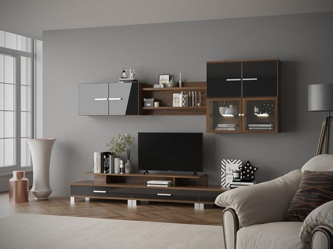 Гостиная Анегри BMS поможет оборудовать эффектную и функциональную гостиную в стиле лофт или минимализм. Практичная модульная конструкция позволит выгодно вписать модель в любую планировку, подчеркнув достоинства интерьера. В комплект входят широкая низкая тумба под ТВ с нишами и выдвижными ящиками, навесные открытые полки, распашной шкафчик и комбинированный с витринным отделением. Оттенки, имитирующие массив дерева и темный глянец, станут главным акцентом в комнате. Купить гостиную Анегри BMS вы сможете в нашем интернет-магазине по лучшей цене.