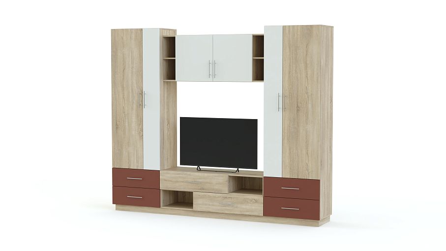Стенка Flora 10 BMS – популярная модель в современном стиле, отличный выбор для небольшой гостиной или квартиры-студии. Выполненная в древесных тонах, компактная стенка декорирована цветными вставками и дополнена практичными ручками-рейлингами. Простая по форме, композиция включает в себя распашные бельевые шкафы, выдвижные ящики, навесную секцию и просторную нишу под ТВ. Купить стенку Flora 10 BMS, подобрав оптимальное цветовое решение, вы сможете в нашем интернет-магазине.