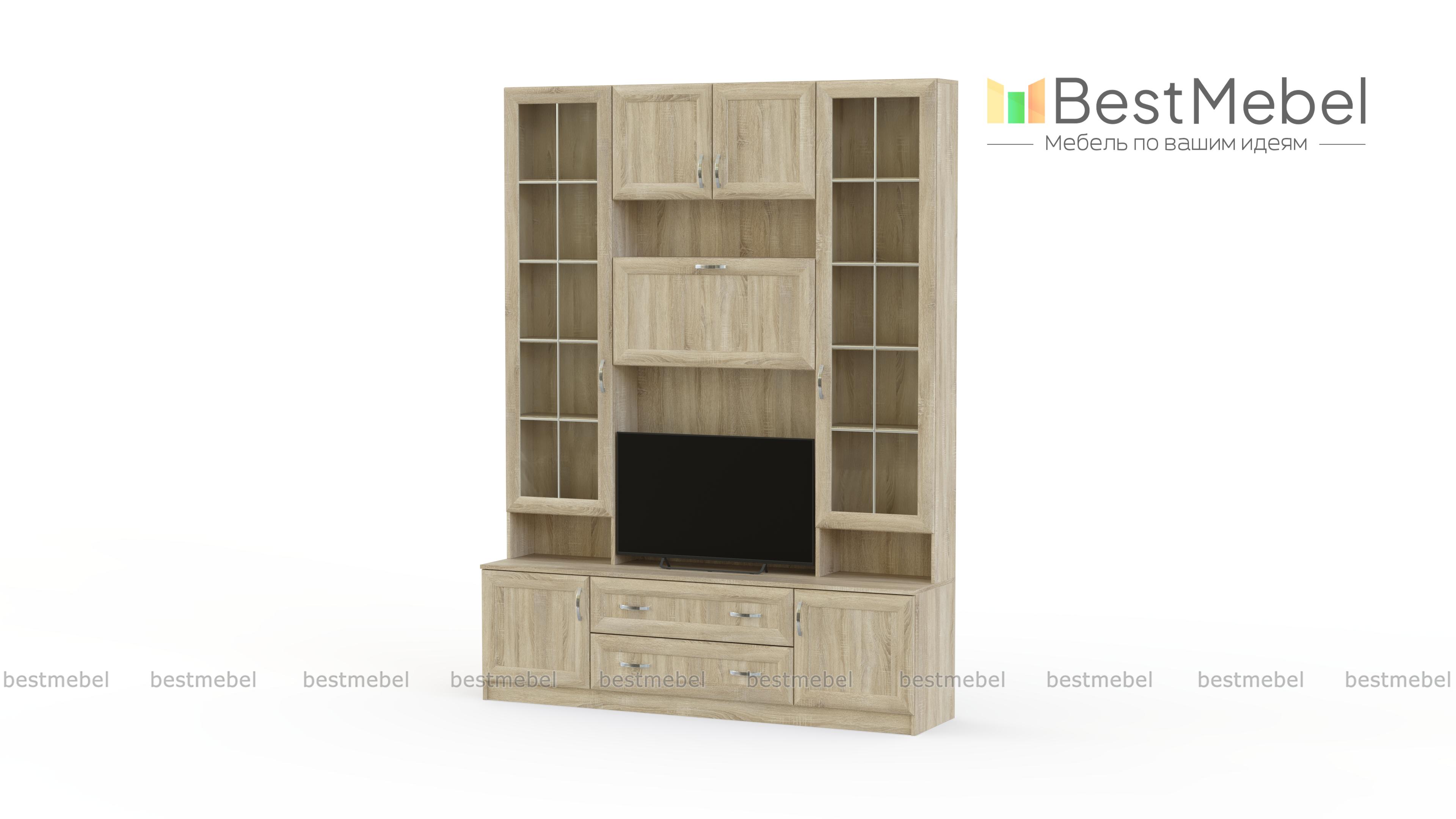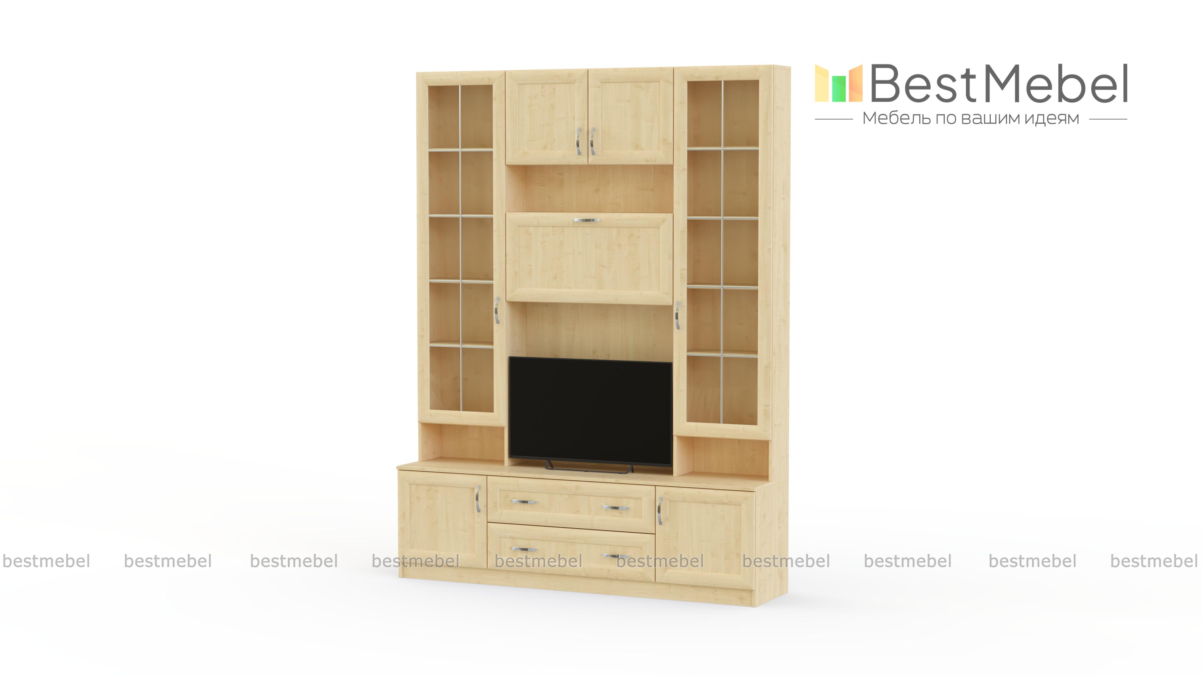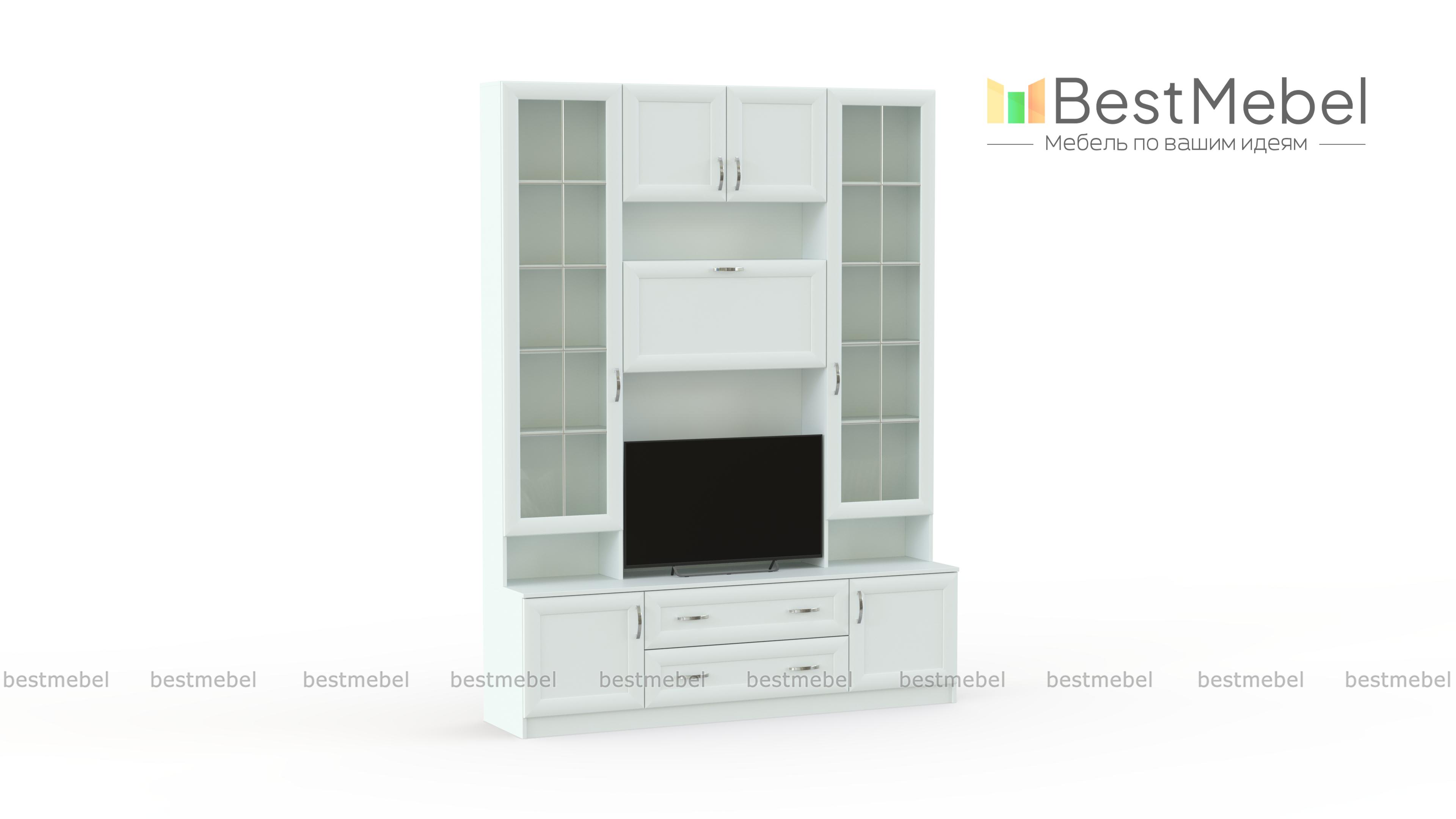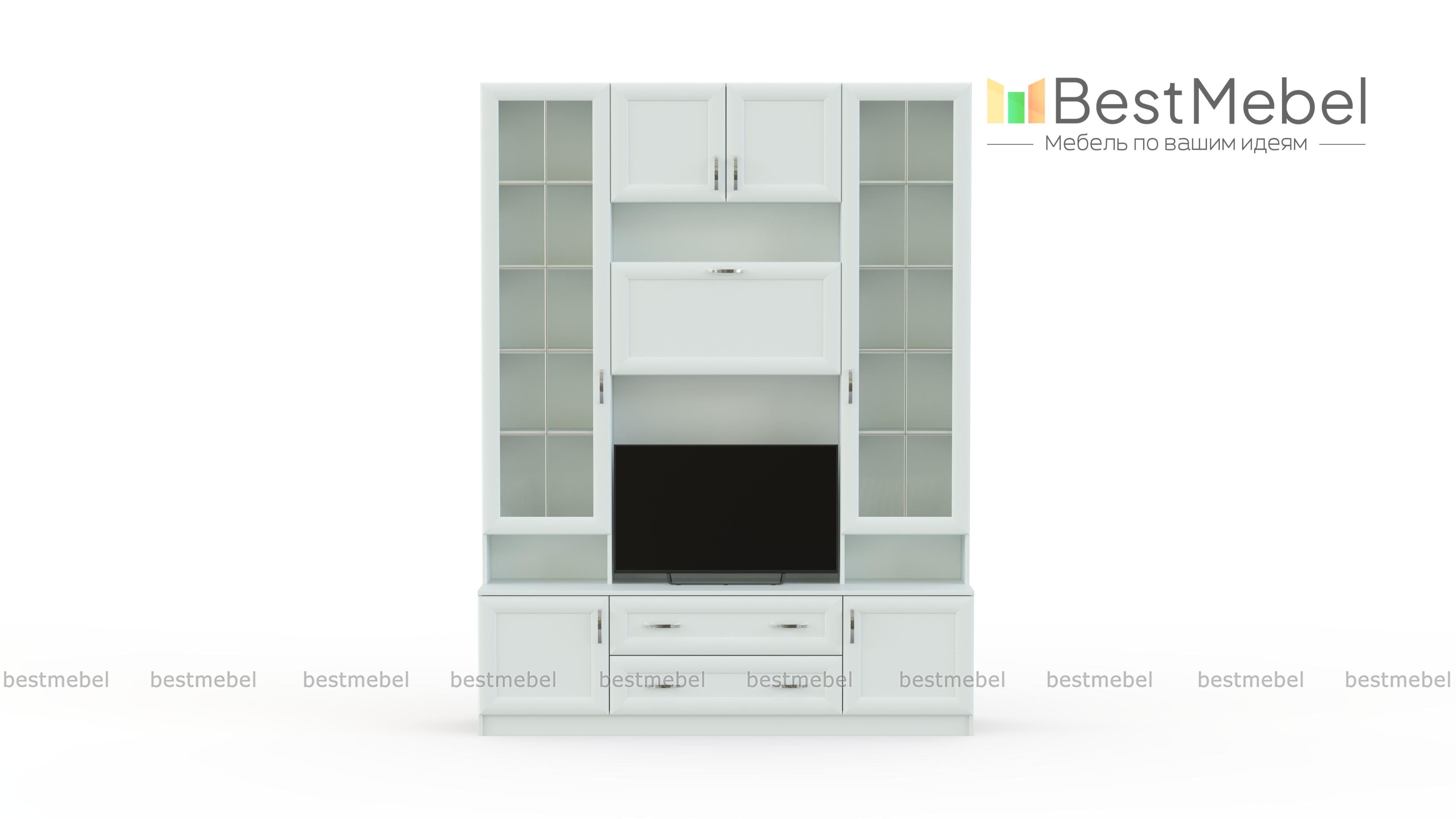 Стенка в гостиную С 446 М BMS отличается компактными размерами и классическим декором рамочных фасадов. Универсальные белые оттенки легко впишутся в традиционный интерьер гостиной. Стенка оборудована тумбой с распашными отделениями и выдвижными ящиками, нишей под ТВ, высокими элегантными витринами и верхней секцией с полкой и глухими дверцами. Оптимальная в малогабаритном помещении, стенка сэкономит полезную площадь и разместит все необходимое. Купить стенку в гостиную С 446 М BMS, подобрав расцветку, вы сможете в нашем интернет-магазине.