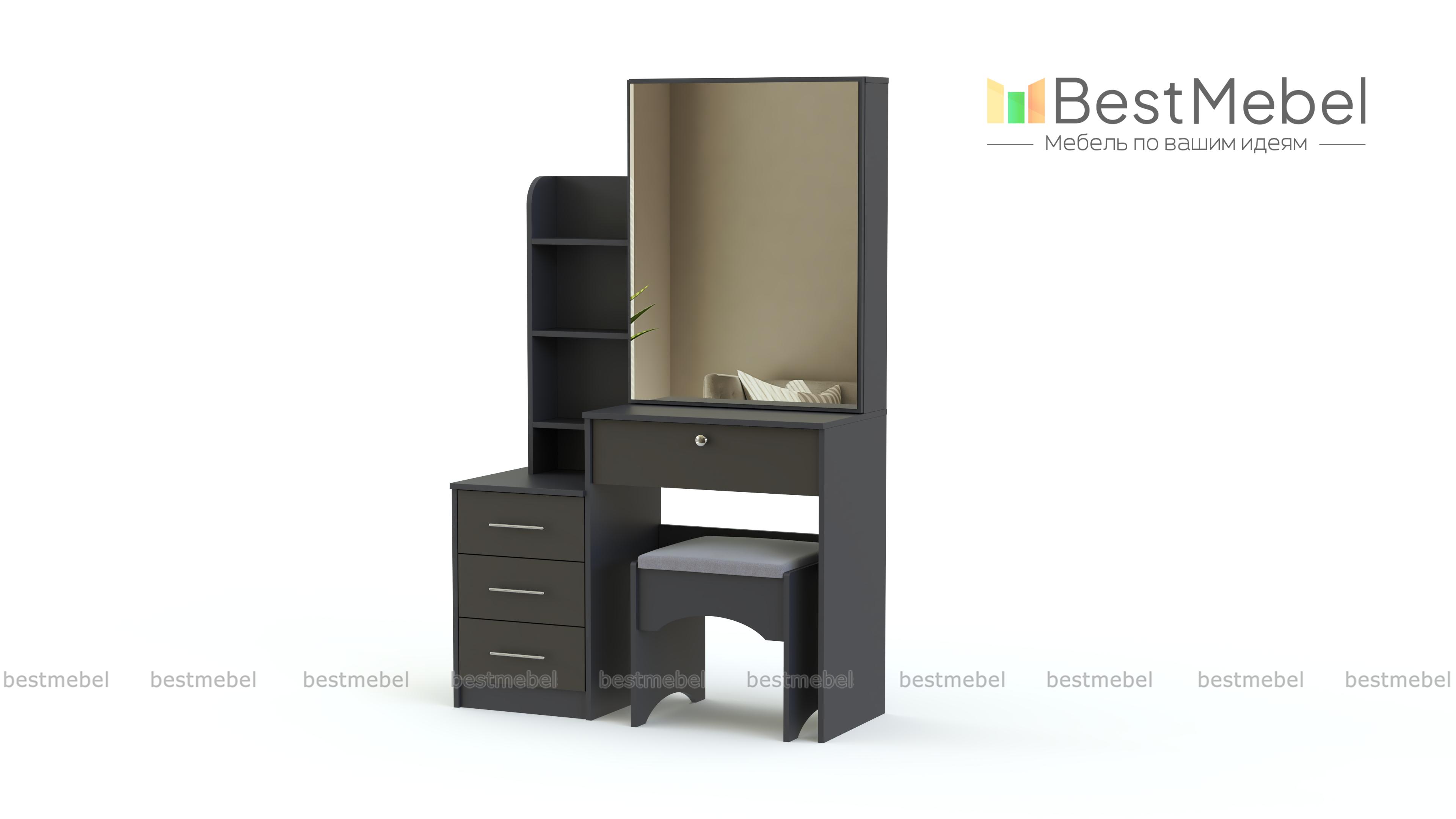Туалетный столик Хлоя 20 BMS оборудован продуманной до мелочей системой хранения, которая позволит разместить в зоне быстрого доступа все необходимые средства по уходу. Практичная разноуровневая модель современного дизайна объединила столик с просторной рабочей поверхностью и выдвижным ящиком, тумбу, мини-стеллаж и зеркальный шкафчик с раздвижной дверцей. Дополнительно установленная окантовка светодиодной лентой поможет нанести макияж в любое время дня. Купить туалетный столик Хлоя 20 BMS приглашаем в наш интернет-магазин.