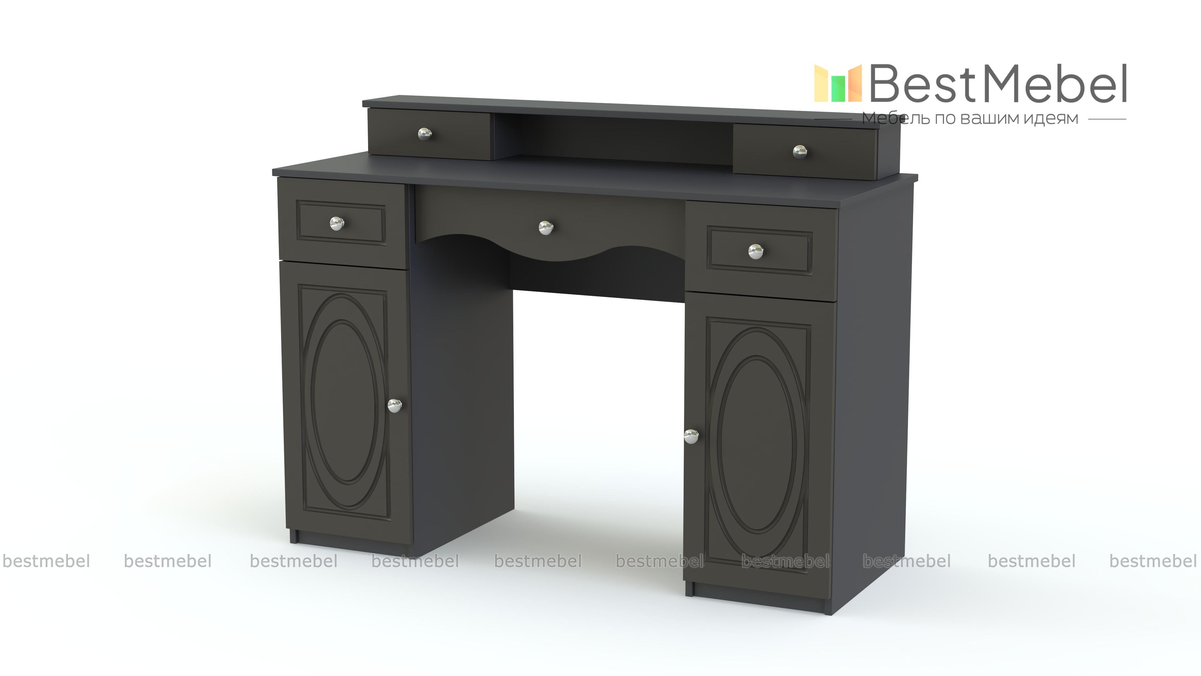 Туалетный столик Лиза 7 BMS станет эффектным дополнением интерьера в стиле модерн или классического. Выполненный в светлых матовых тонах, столик декорирован оригинальной фрезеровкой и изящными ручками-кнопками. Двухтумбовая модель оборудована выдвижными ящиками и распашными отделениями для хранения средств по уходу, на столешнице располагается надстройка с нишей и парой мини-ящиков. Купить туалетный столик Лиза 7 BMS вы сможете в нашем интернет-магазине по лучшей цене.