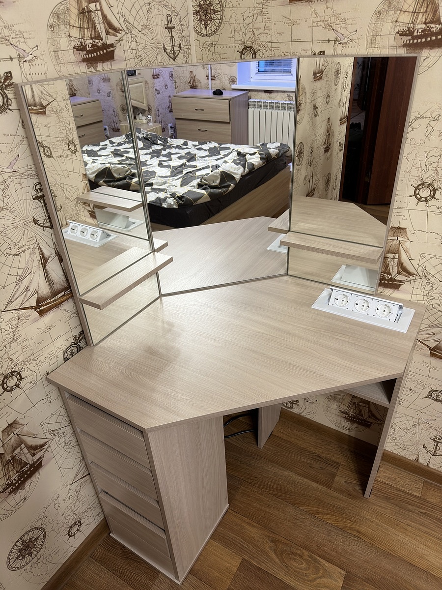 Классный удобный столик. Ящички маловаты, нужно понимать. Стандартный фен еле влез. Так же нет розеток, пришлось выводить самому. Пришел с поцарапанным стеклом, без вопросов обменяли и обещали привезти новый элемент в течении недели.