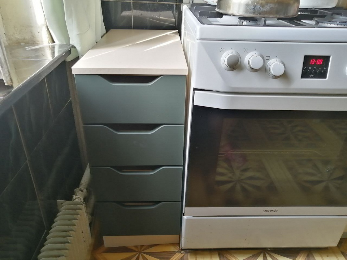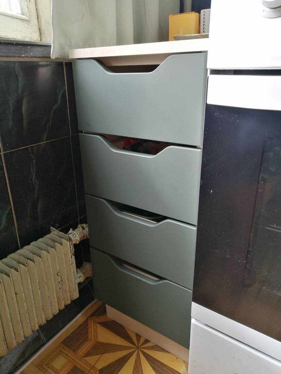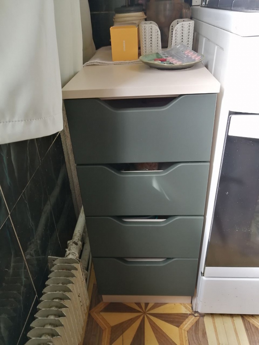 Хороший маленький шкаф на кухню, идеально вписался в угол между окном и плитой. Полки вмещают не очень высокие предметы, но для всяких кухонных мелочей - идеально. + дополнительная поверхность рядом с плитой.