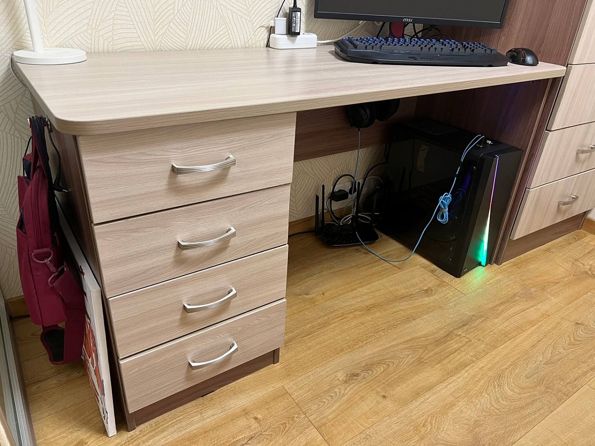 Заказ №443070. Заказывал данный стол вместе со шкафом во время ремонта в квартире, основное достоинство - возможность выбрать необходимые размеры изделия, чтобы оно максимально продуктивно вписалось в интерьер. Немного криво сделаны фасады ящиков, а в остальном всё отлично.